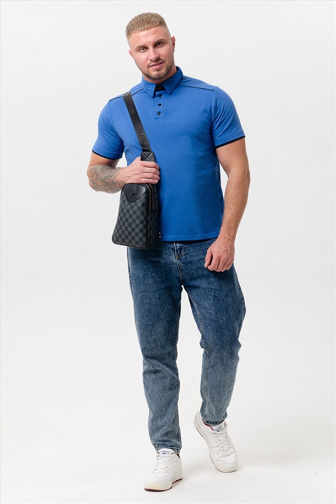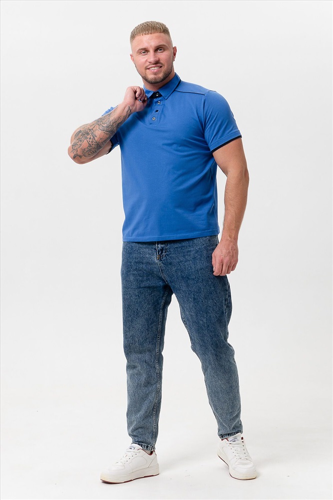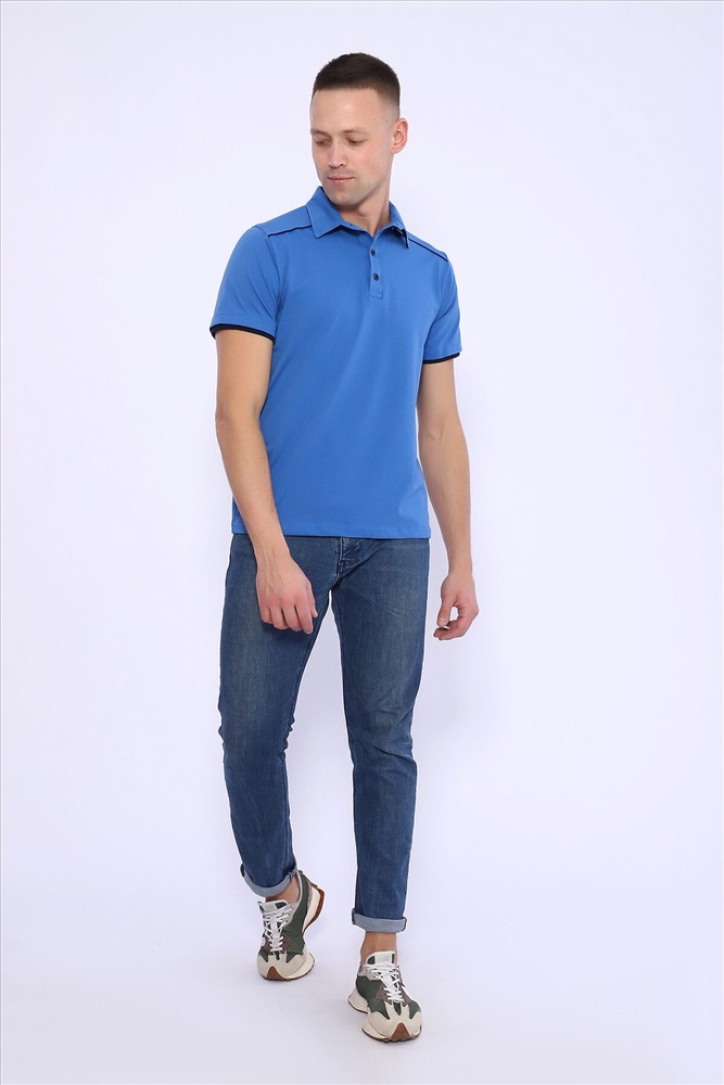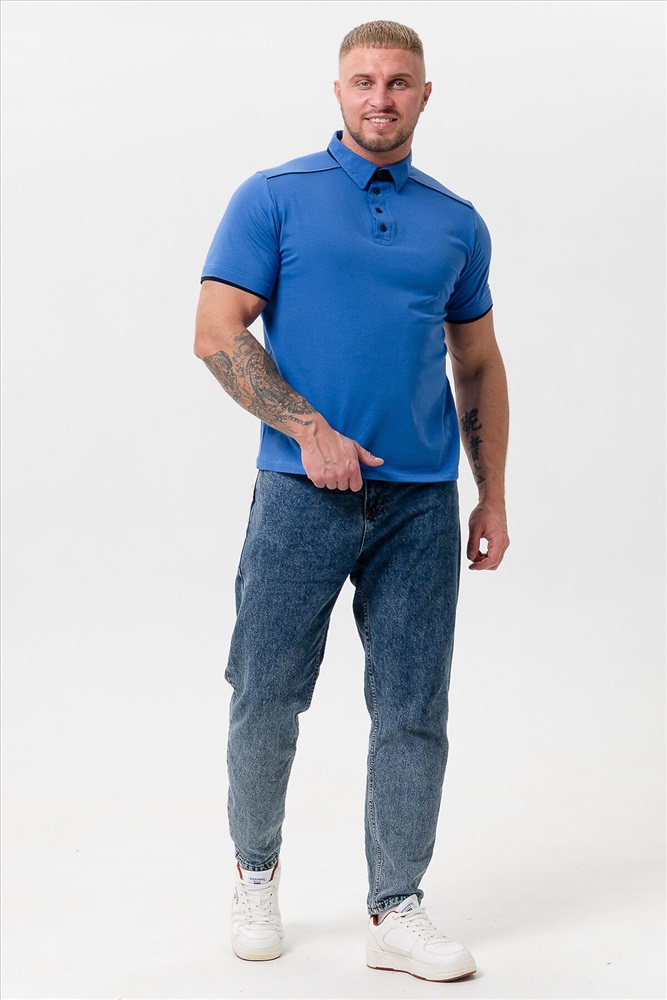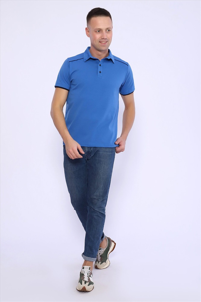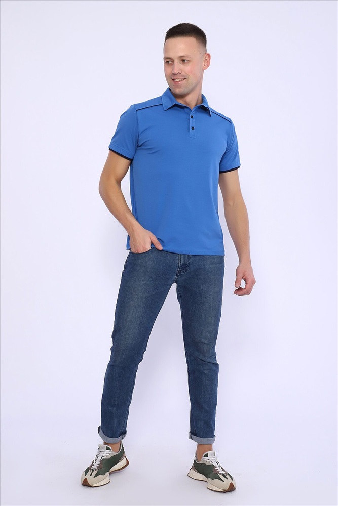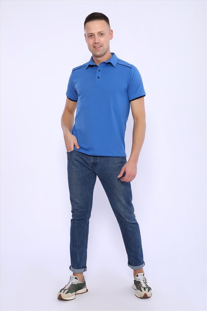 Поло мужское из кулирки с лайкрой 92% хлопок 8 % лайкра. Поло с рубашечным воротником, планка на пуговицы, на спинке кокетка, отделочные детали и кант на плечах и кокетке из темно-синего трикотажа. Футболка отлично подойдет для дома и отдыха.