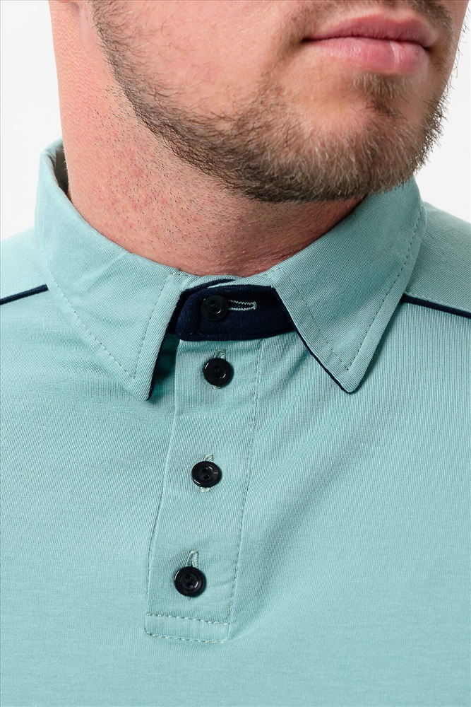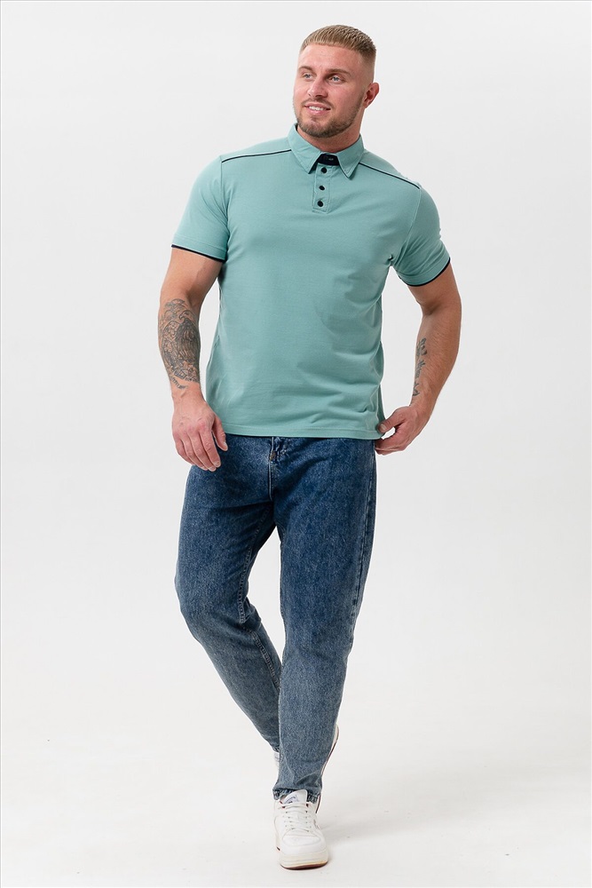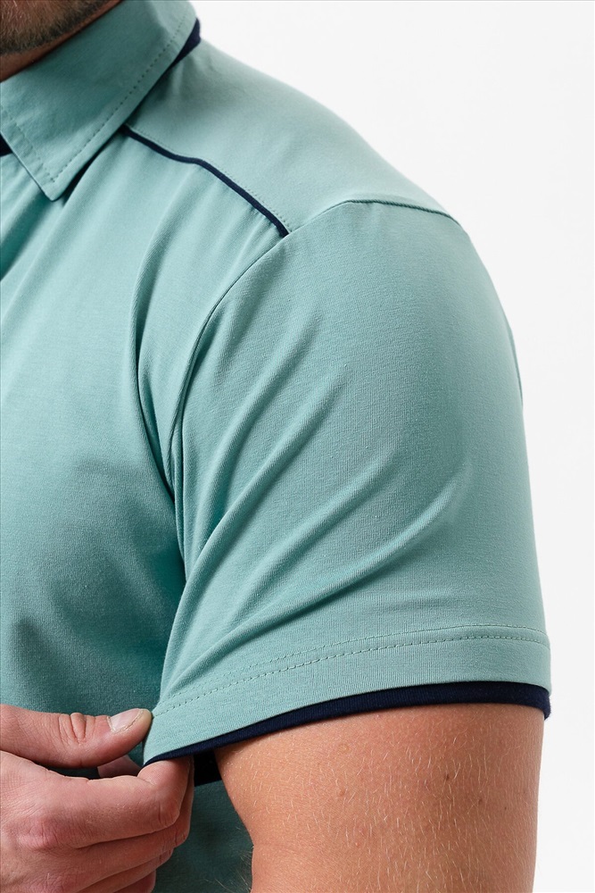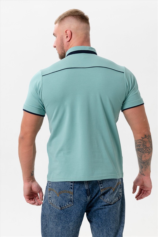 Поло мужское из кулирки с лайкрой 92% хлопок 8 % лайкра. Поло с рубашечным воротником, планка на пуговицы, на спинке кокетка, отделочные детали и кант на плечах и кокетке из темно-синего трикотажа. Футболка отлично подойдет для дома и отдыха.