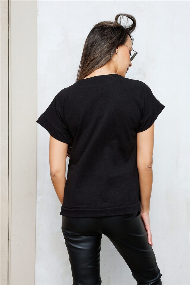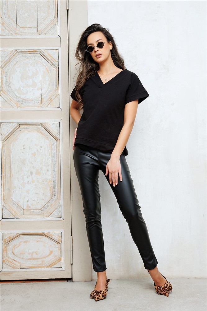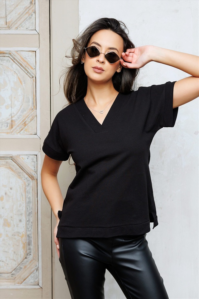 Практичная футболка лаконичного дизайна. Модель выполнена в насыщенной расцветке. Рукав короткий. Вырез горловины V-образный. Ткань - трикотажное полотно, обладающее мягкостью и растяжимостью. Состав: 100% хлопок. Длина изделия 54 см. Рост модели на фото 173 см.