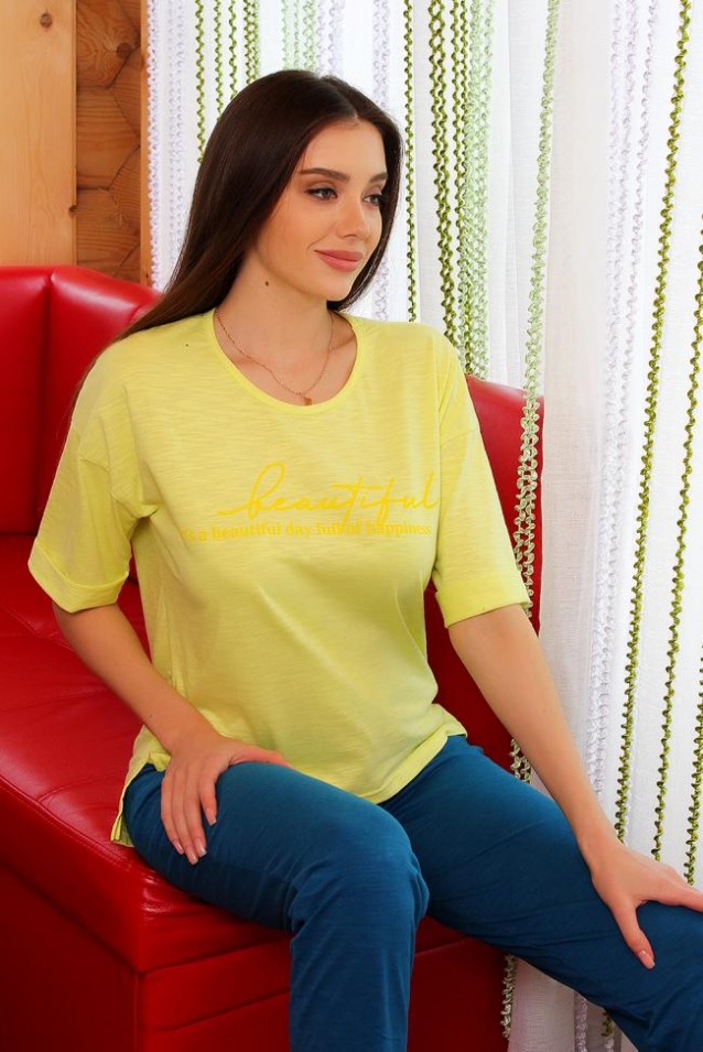 Футболка женская с коротким рукавом в стиле оверсайз. Данная модель выполнена из трикотажного полотна кулирка флам (хлопок 100%). На полочке присутствует принт. На рукавах присутствуют манжеты, в боковых швах разрезы. Отлично подходит для прогулок и отдыха.