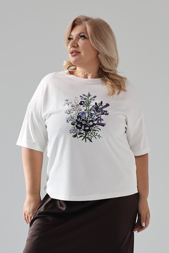 Футболка прямого кроя из мягкого трикотажа. Модель имеет круглый вырез с узким кантом и короткие приспущенные рукава. Свободный силуэт искусно обыгрывает фигуру и не сковывает движений. Актуальная шелкография на груди освежает образ и добавляет нарядности. Модель легко сочетается с любым низом, поэтому скомбинировать чудесный и стильный образ с легинсами, брюками, шортами и джинсами не составит труда.