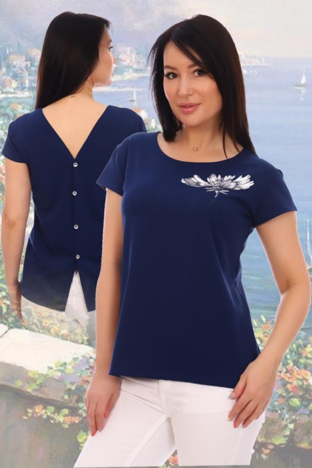 Футболка молодёжная с мерцающим принтом на груди, из эластичного, высококачественного, приятного к телу трикотажа. Горловина круглая, короткий рукав, слегка расклешенная к низу. Имитация распашной спинки украшена декоративными пуговицами, что придаёт футболке некую изюминку. Модель интересная, универсальная, её можно носить с брюками или джинсами, а также с юбкой. Подойдёт как для работы в офисе, так и для повседневного гардероба.
