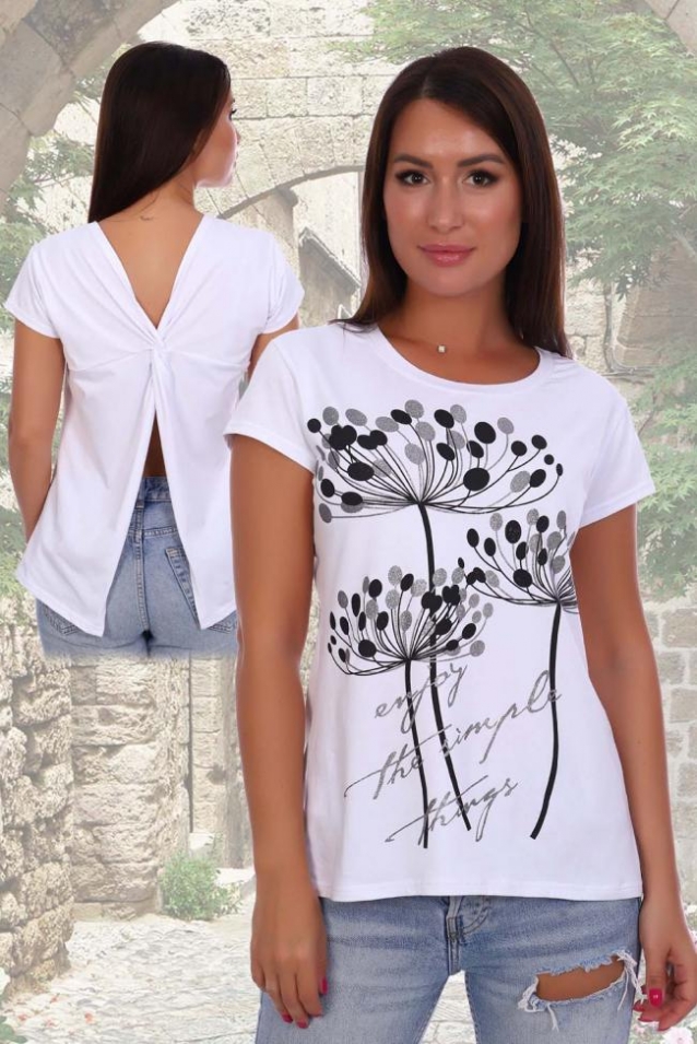Молодежная футболка с мерцающим принтом из мягкого, эластичного трикотажа, качества ПЕНЬЕ. Круглая горловина обработана обтачкой, короткий рукав. Спинка распашная декорирована драпировкой с необработанными краями, в виде узла, что придаёт изделию некую изюминку.