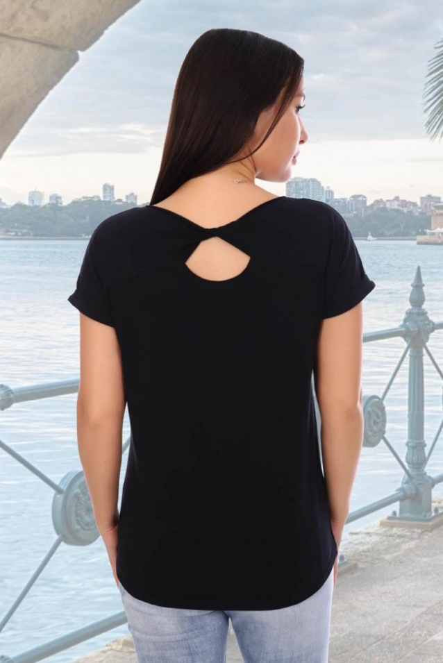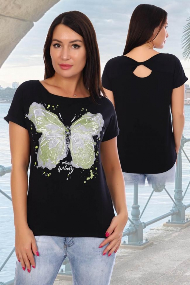 Футболка женская с мерцающим принтом из мягкого, эластичного трикотажа качества ПЕНЬЕ. Спущенная пройма обработана манжетом с отворотом. На спинке кокетка с драпировкой в виде узла с необработанными краями и вырезом в виде улыбки, низ спинки слегка удлинён. Модель интересная, свободного покроя, подойдёт на любую фигуру.