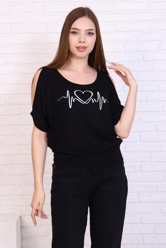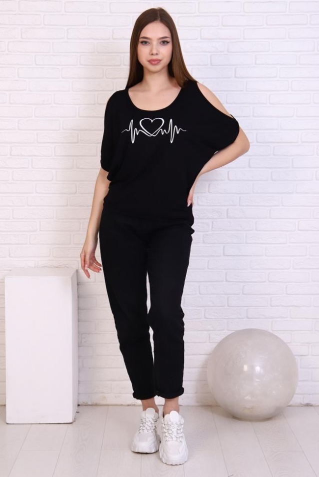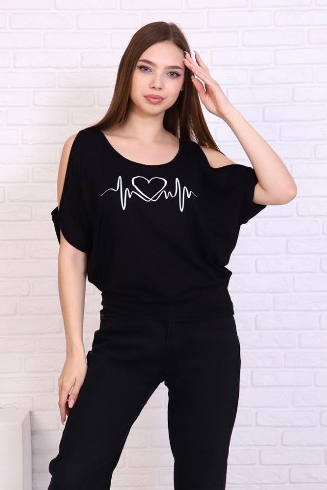 Футболка с молодёжным принтом из приятной к телу вискозы. Модель летучая мышь в стиле ОВЕРСАЙЗ, с глубоким декольте, большими разрезами по рукаву, что придаёт изделию некую изюминку и привлекательность. Низ футболки обработан широким манжнтом. Отличный вариант для летнего гардероба.