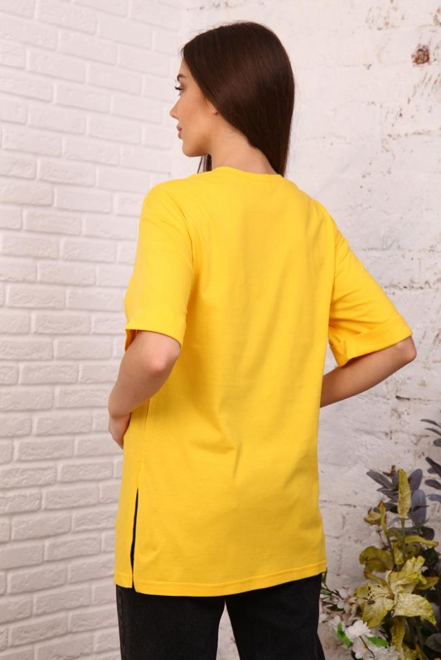 Футболка женская оверсайз. Свободного покроя со спущенными плечами. Горловина округлой формы, по бокам футболки разрезы. На полочке выполнен модный принт. В этой футболке Вы будете выглядеть стильно.
