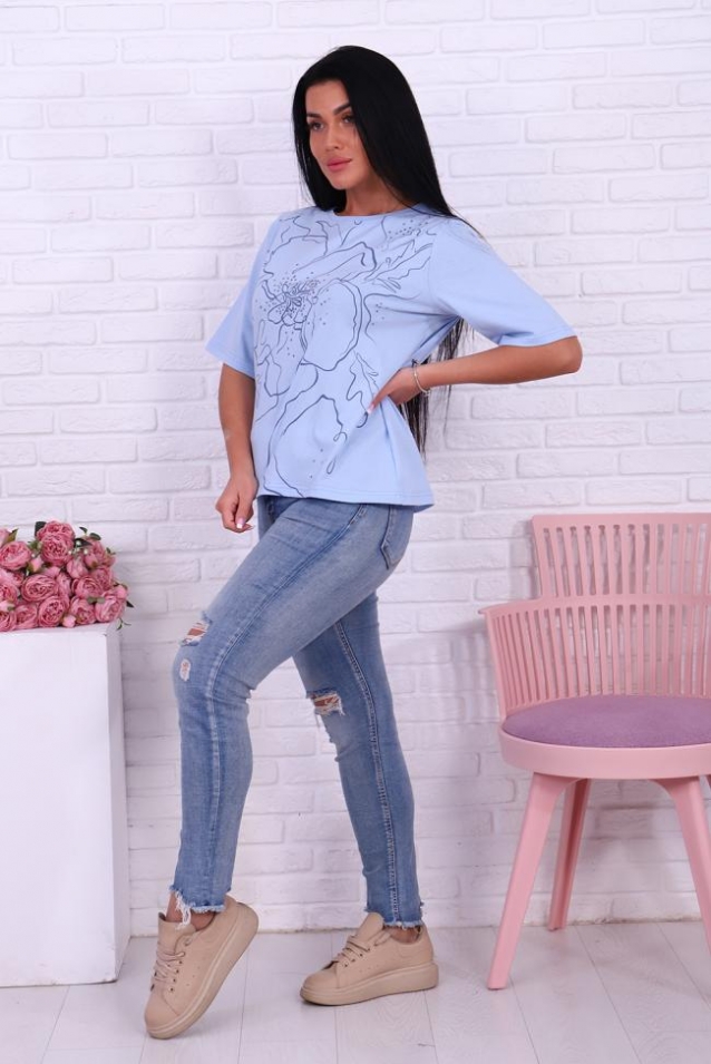 Футболка 4493 женская с нежным принтом во всю полочку понравится многим! Модель свободного кроя, линия плеча прямая, рукав удлиненный до локтя, горловина обработана обтачкой из основного материала, рукава и низ вподгибку.