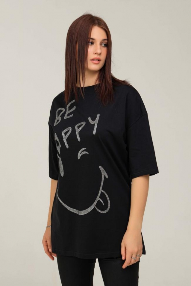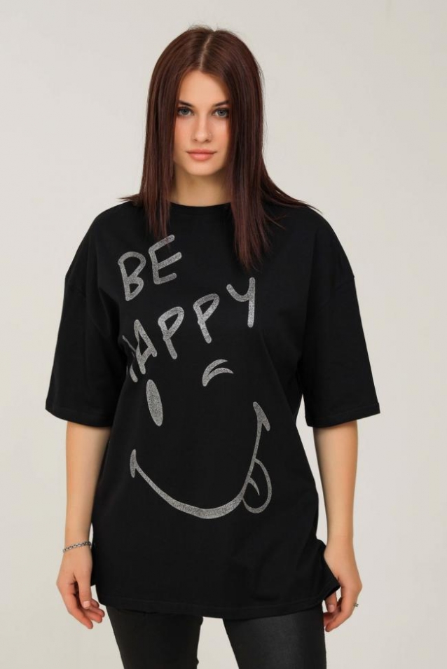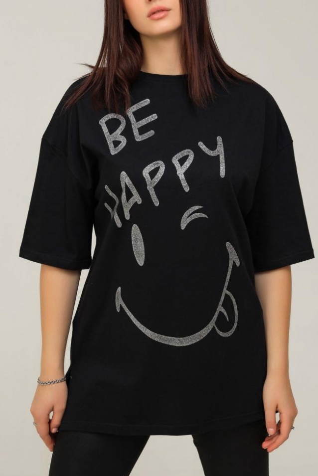 Удлиненная женская футболка длинной до середины бедра представлена в 5 расцветках - яркие жёлтый, голубой и розовый цвета выделят Вас и прекрасно подчеркнет Вашу женственность, а базовые черный и, конечно же, белый цвета не утратят своей актуальности. Модели такой длины прекрасно смотрятся с брюками-дудочками, велосипедками или облегающими джинсами. В прохладную погоду хорошо будет смотреться в паре с утепленной жилеткой или курткой. На модели черного цвета нанесена печать глитером, который сверкает на солнце как алмазы, на остальных цветах печать в черном цвете, которая прекрасно контрастирует со светлыми тонами изделия. Модель выполнена из хлопка высшего качества плотность хлопка 170гр/м2. Это качество ткани люксовых изделий. Размер на модели - 48,