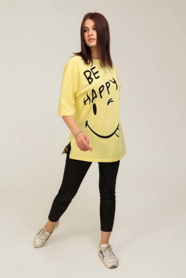 Удлиненная женская футболка длинной до середины бедра представлена в 5 расцветках - яркие жёлтый, голубой и розовый цвета выделят Вас и прекрасно подчеркнет Вашу женственность, а базовые черный и, конечно же, белый цвета не утратят своей актуальности. Модели такой длины прекрасно смотрятся с брюками-дудочками, велосипедками или облегающими джинсами. В прохладную погоду хорошо будет смотреться в паре с утепленной жилеткой или курткой. На модели черного цвета нанесена печать глитером, который сверкает на солнце как алмазы, на остальных цветах печать в черном цвете, которая прекрасно контрастирует со светлыми тонами изделия. Модель выполнена из хлопка высшего качества плотность хлопка 170гр/м2. Это качество ткани люксовых изделий. Размер на модели - 48,