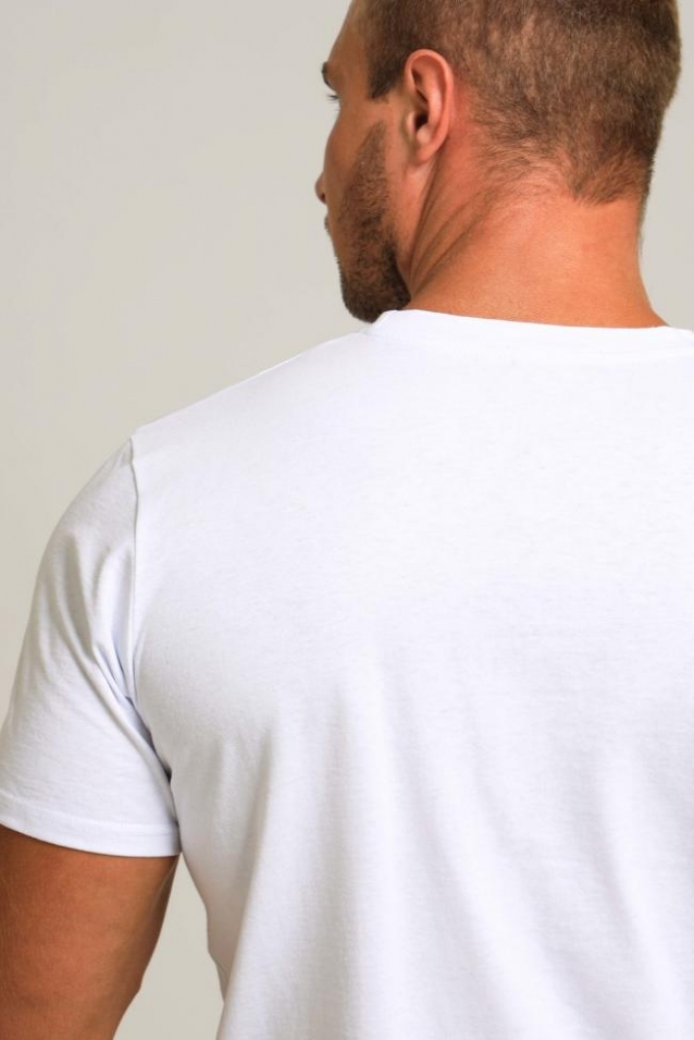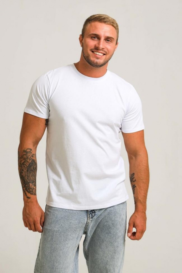 Мужская футболка однотонная, представлена в 3 базовых цветах - белый, черный, темно-синий. Спинка горловины отделана усилением. Плотная, износостойкая ткань не просвечивает и не вытягивается. Плотность ткани 190гр/м2. Размер на модели 52.