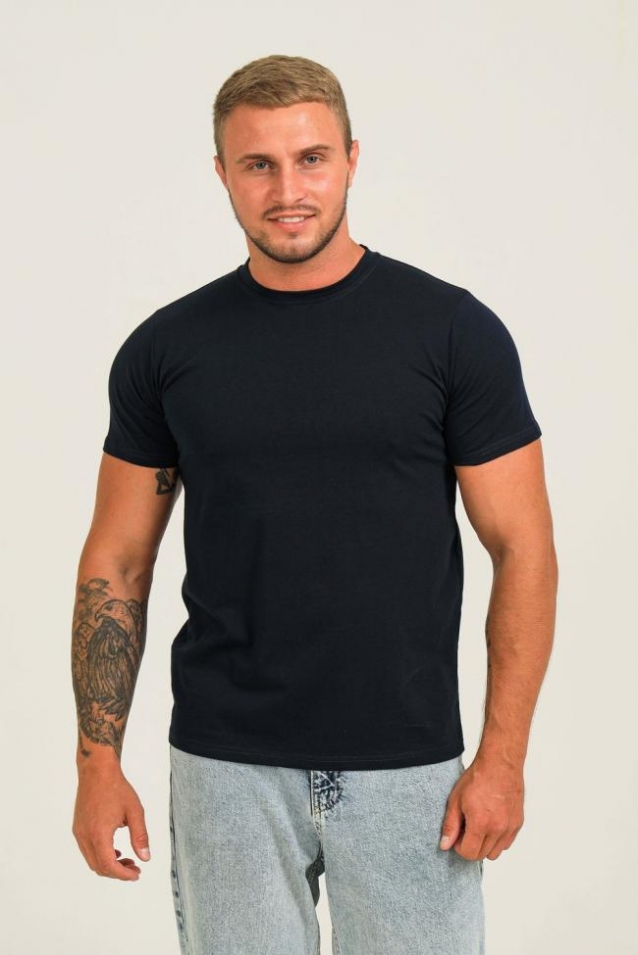 Мужская футболка однотонная, представлена в 3 базовых цветах - белый, черный, темно-синий. Спинка горловины отделана усилением. Плотная, износостойкая ткань не просвечивает и не вытягивается. Плотность ткани 190гр/м2. Размер на модели 52.