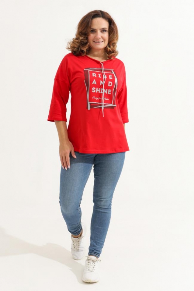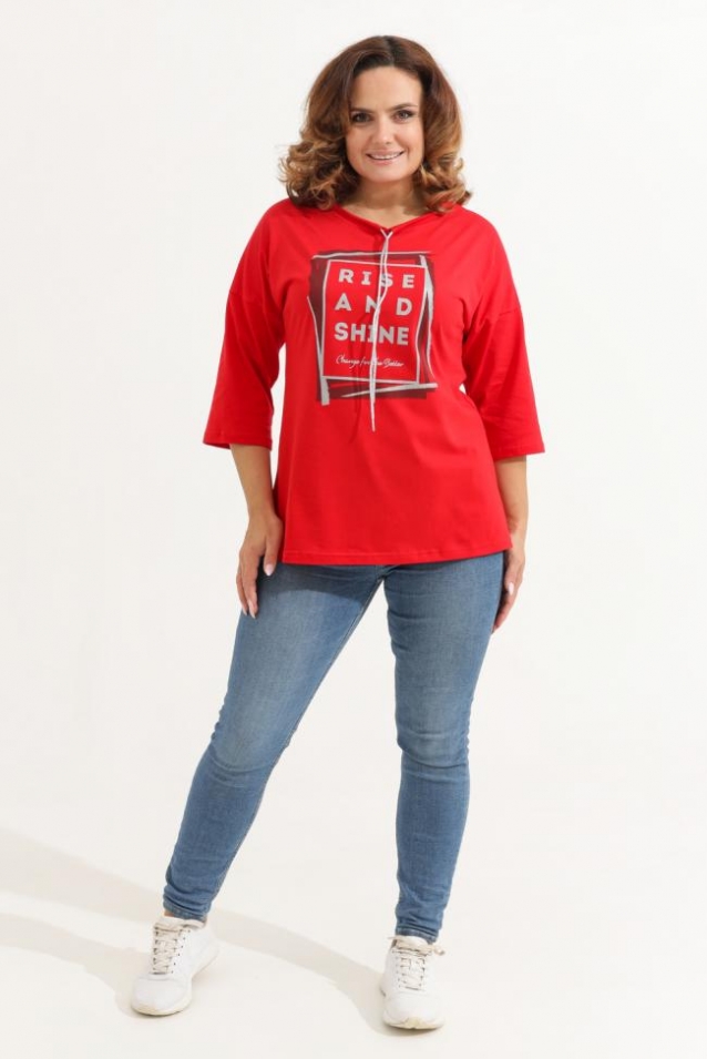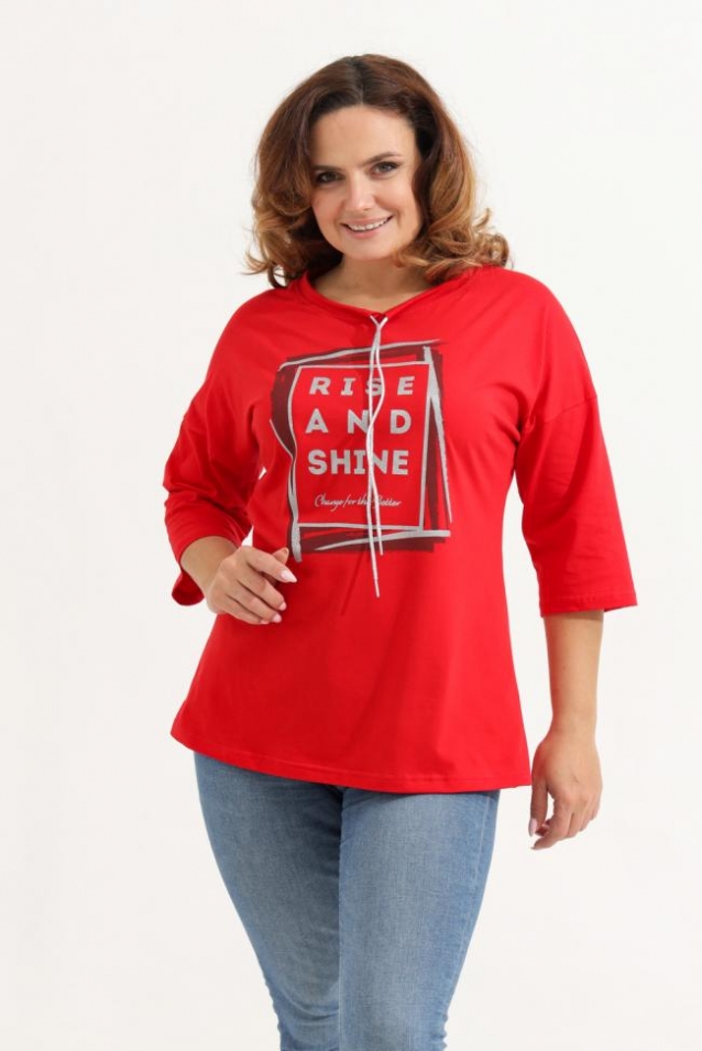 Описание для них - Удлиненная женская футболка со шнурком, длиной до середины бедра с округлым вырезом горловины. Представленная в цветах - красный, фисташковый, лиловый, молочный и черном не утратят своей актуальности. Модели средней длины прекрасно смотрятся с брюками - дудочками или облегающими джинсами. В прохладную погоду хорошо будет смотреться в паре с утепленной жилеткой или курткой. Принт из блестящего глиттера прекрасно гармонирует с серебристым шнурком. Модель выполнена из хлопка высшего качества. Размер на модели 48. Параметры 105-86-98/169 Футболка со шнурком пенье 170 гр/м2