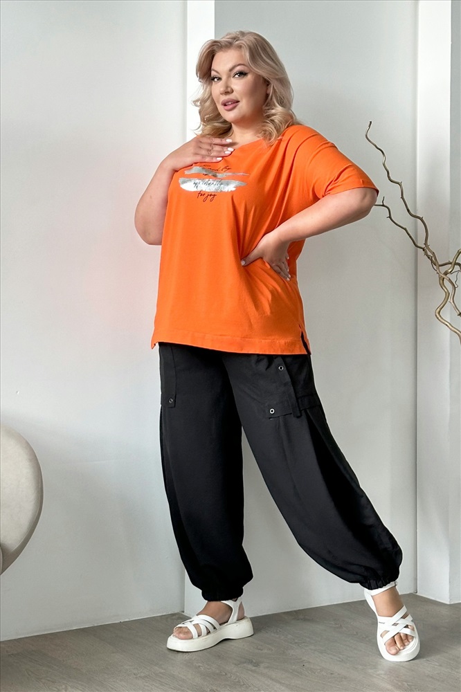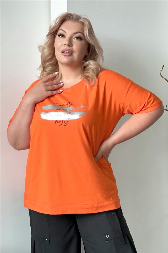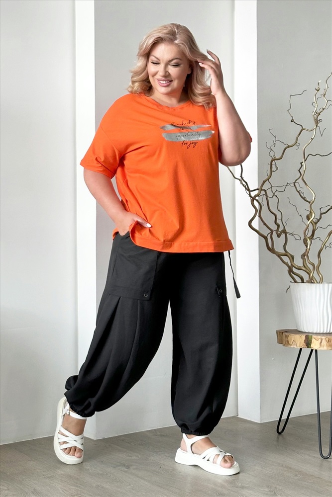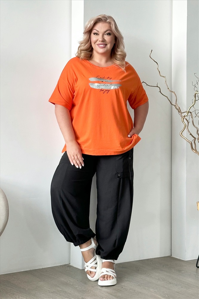 Футболка прямого кроя из мягкого трикотажа. Модель имеет круглый вырез с узким кантом и короткие цельнокроеные рукава. Свободный силуэт искусно обыгрывает фигуру и не сковывает движений. Актуальная шелкография на груди освежает образ и добавляет нарядности. Небольшие разрезы по бокам способствует оптимальной посадке по фигуре. Модель легко сочетается с любым низом, поэтому скомбинировать чудесный и стильный образ с легинсами, брюками, шортами и джинсами не составит труда.