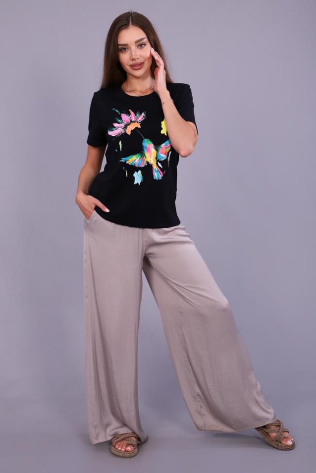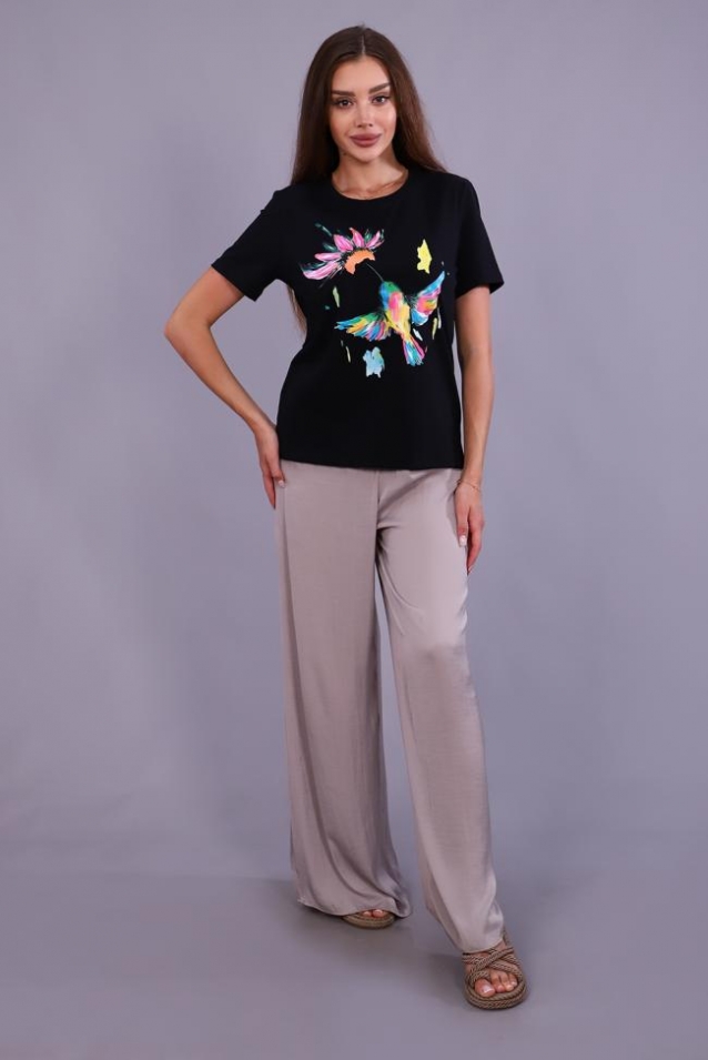 Футболка классического фасона, с коротким рукавом и округлым вырезом. Декорирована принтом. Универсальная модель футболки отлично подойдет для любого образа и станет необходимой вещью в вашем гардеробе