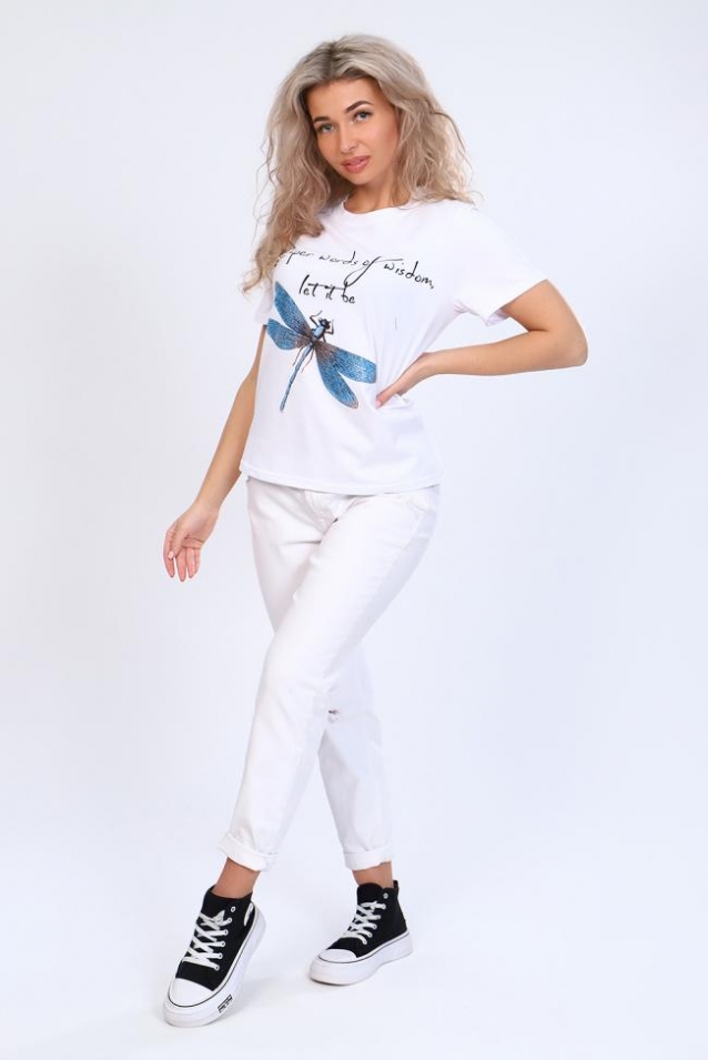 Футболка классического фасона, прямого кроя, с коротким рукавом и округлым вырезом. Декорирована принтом. Универсальная модель футболки отлично подойдет для любого образа и станет необходимой вещью в вашем гардеробе. Ткань кулирка пенье, плотность 160 г.