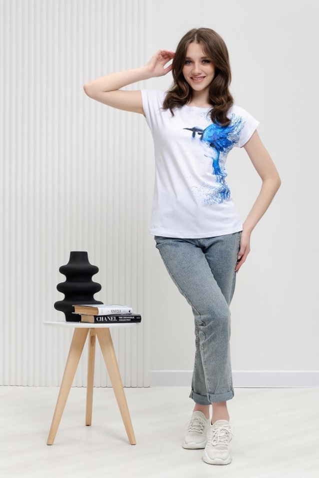 Футболка полуприлегающего силуэта, средней длины, с округлой горловиной. Рукав цельнокроеный, короткий.