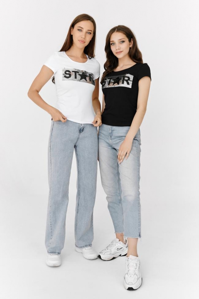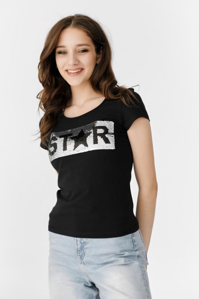 Футболка полуприлегающего силуэта, с округлой горловиной, длиной до середины бедра. Рукав втачной короткий. Горловина обработана бейкой из основного полотна. Пайетки двусторонние