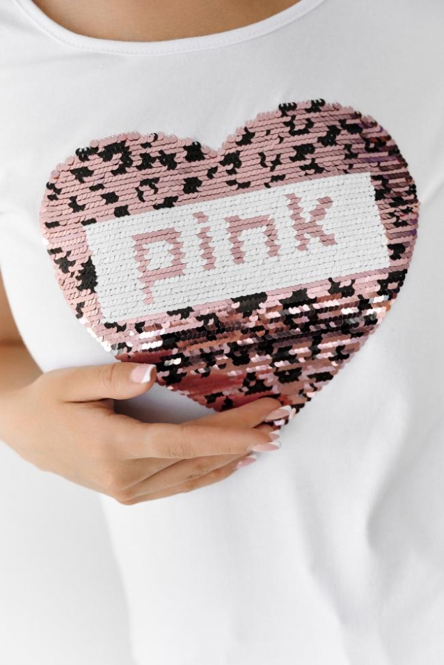 Футболка полуприлегающего силуэта, с округлой горловиной, длиной до середины бедра. Рукав втачной короткий. Горловина обработана бейкой из основного полотна.