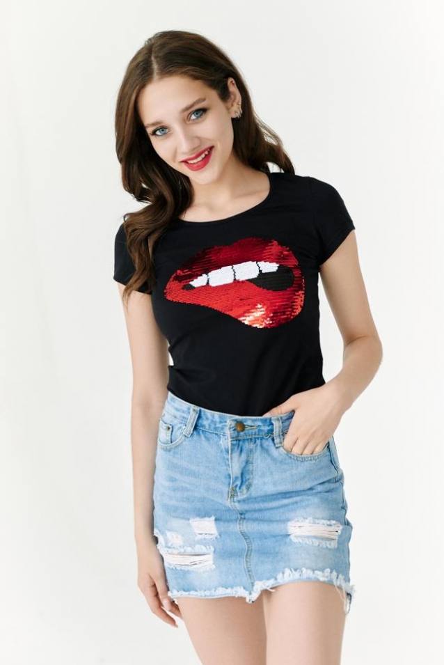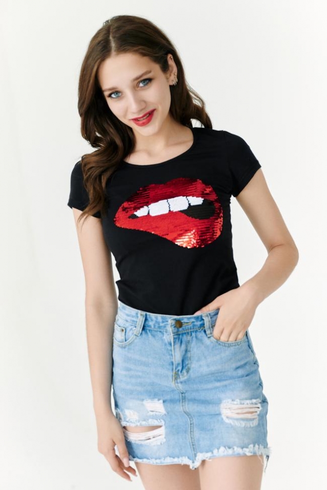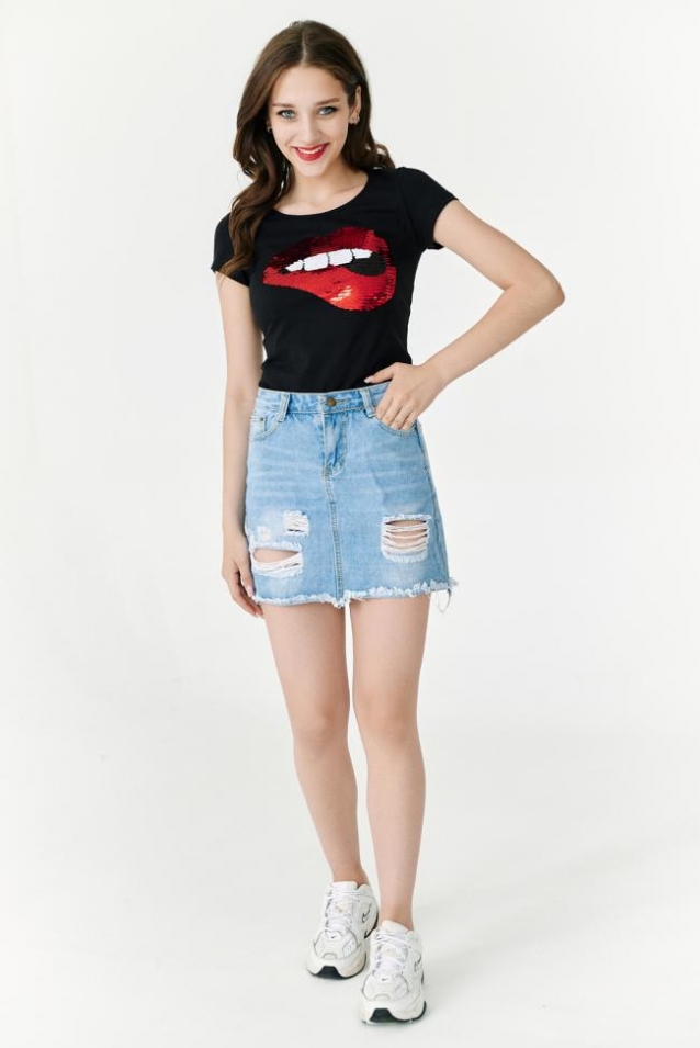 Футболка полуприлегающего силуэта, с округлой горловиной, длиной до середины бедра. Рукав втачной короткий. Горловина обработана бейкой из основного полотна.