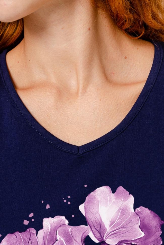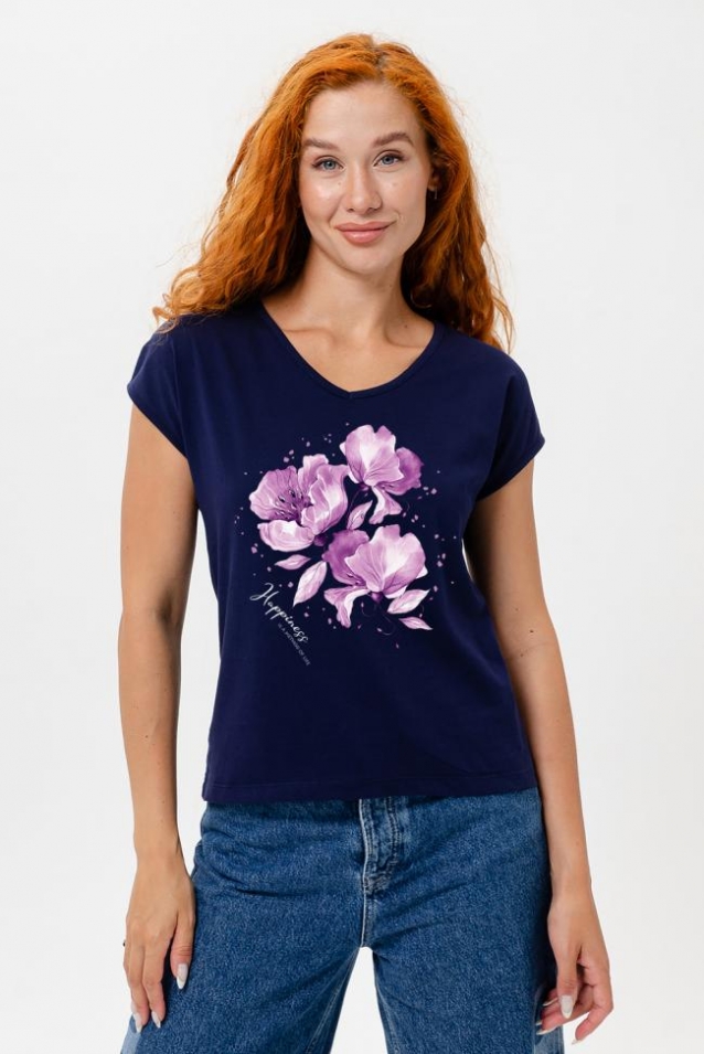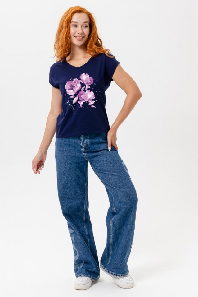 Футболка полуприлегающего силуэта, средней длины, с V-образной горловиной. Рукав цельнокроеный, короткий. Горловина и пройма обработаны бейкой из основного полотна.