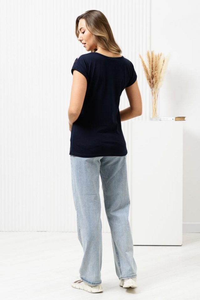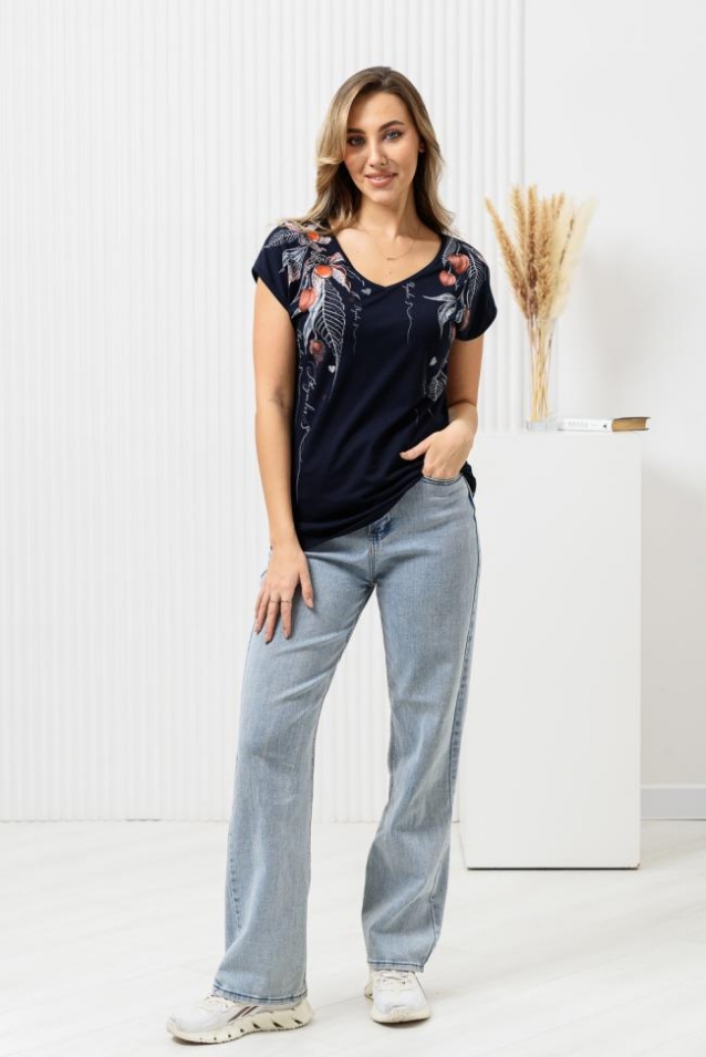 Футболка полуприлегающего силуэта, средней длины, с V-образной горловиной. Рукав цельнокроеный, короткий. Горловина и пройма обработаны бейкой из основного полотна.