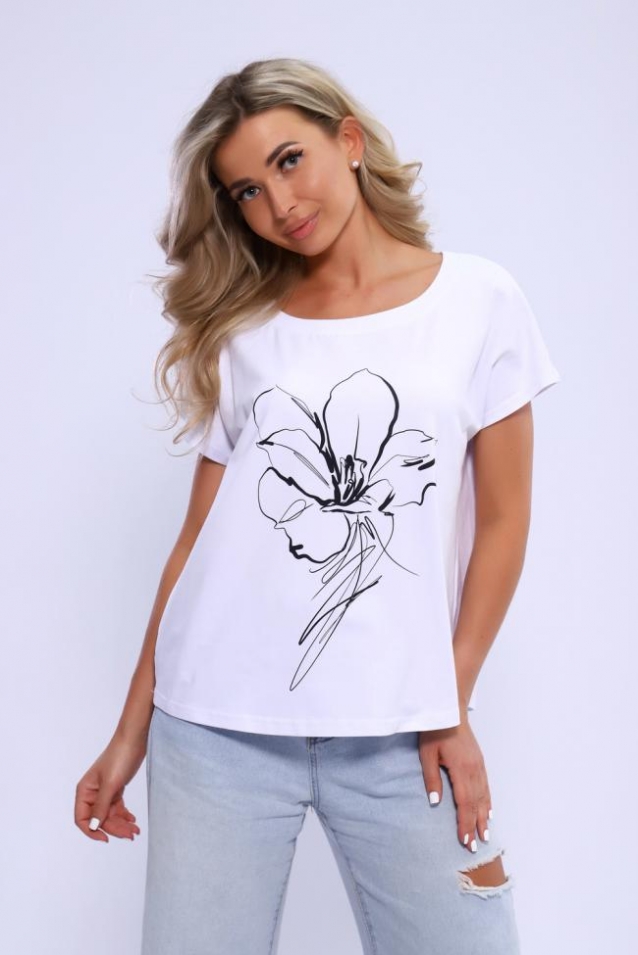 Женская футболка свободного кроя со спущенной линией плеча из эластичной и мягкой кулирки, которая выдерживает более 100 циклов стирки, за счет качественного состава, прослужит долго! Изделие базовое, подойдет под любой гардероб и случай. Данная модель футболки, представлена в одном цвете с принтом в виде фантазийного цветка. По спинке допустим шов. На фото модель представлена в 48 размере.