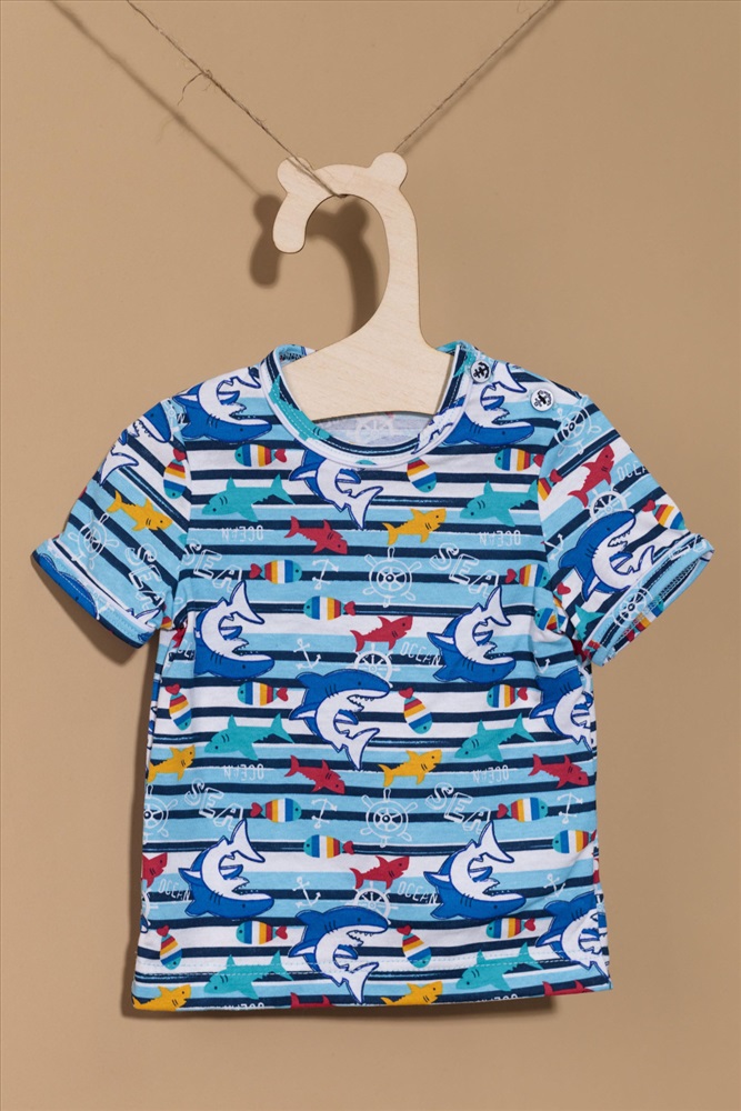 Цвет Номенклатуры: голубой Футболка из кулирки, 100% хлопок. С коротким рукавом. На левом плече застежка на пуговицы. Горловина и низ рукавов обработаны бейкой с кантом.