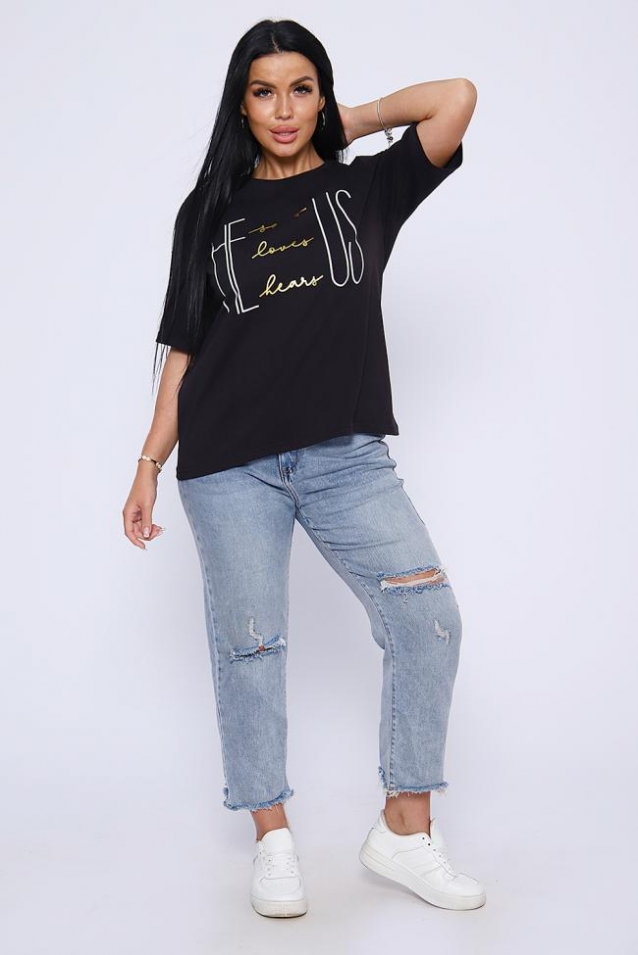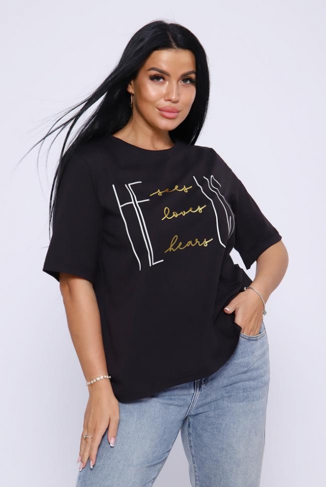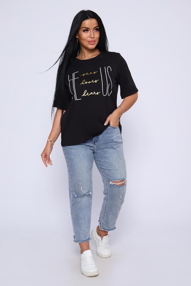 Футболка с благородным блеском золота на необыкновенно женственном принте HE US притягивает взгляд и позволяет чувствовать себя необыкновенной! Прямой силуэт, выверенная длина рукава до локтя, обработка деталей вкруговую с закрепкой. Горловина выполнена из основной ткани. Большие размеры!