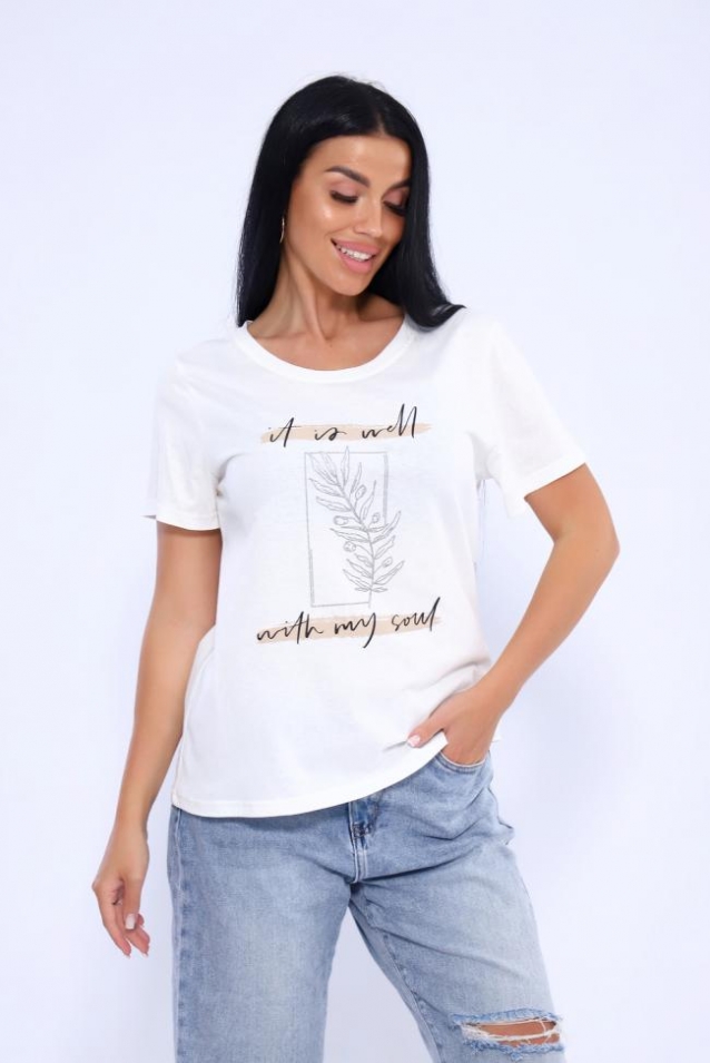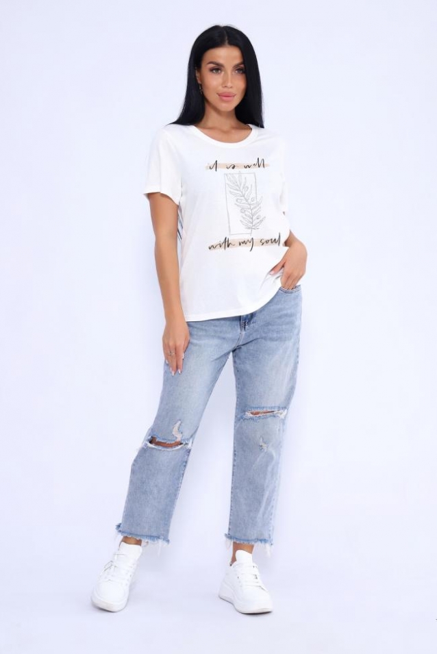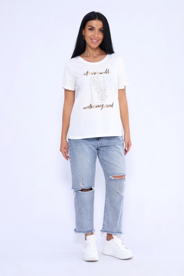 Прекрасный вариант для летнего отдыха и комфортного лука на каждый день! Нежные, пастельные расцветки и принт с французским блеском придают стиль и шарм. Футболка изготовлена из мягкого 100% хлопка. Фасон приталенный. Горловина обработана обтачкой с последующей отстрочкой. Рукава и низ изделия в подгибку. Маломерит на размер!