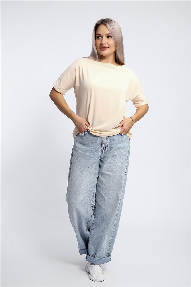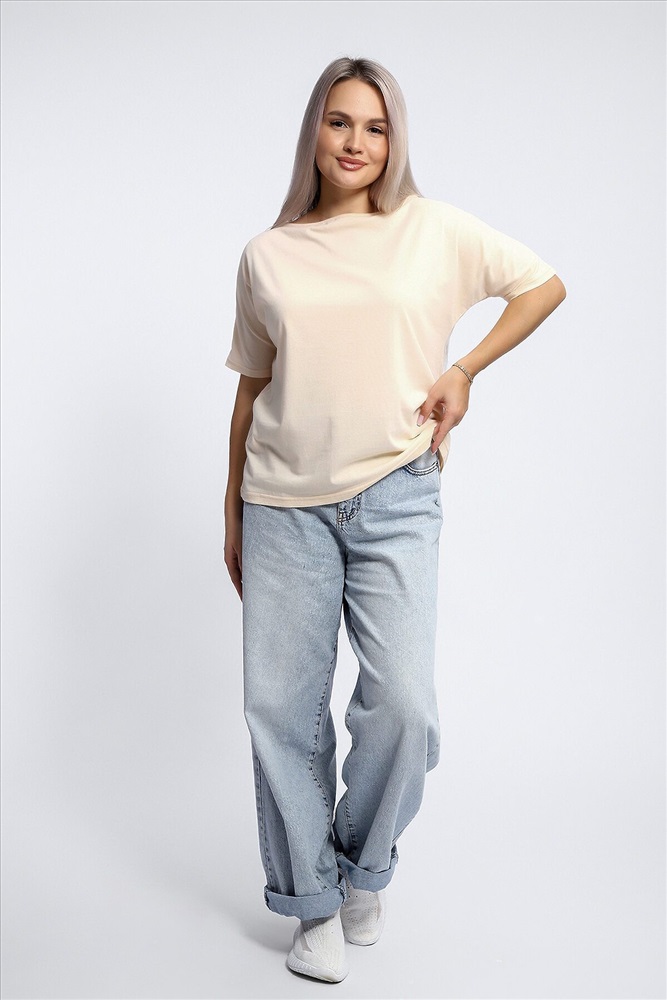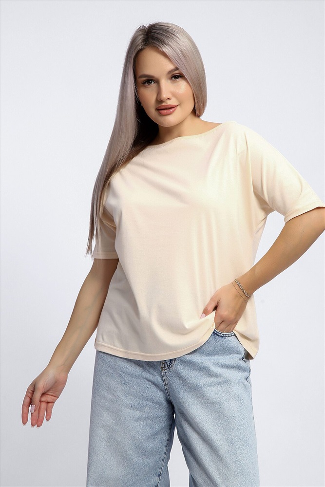 Футболка женская выполнена из мягкой хлопковой ткани. Модель со спущенной линией плеча, горловина обработана однотонным кантом. Цвет ткани нежно-персиковый, фото плохо передает.