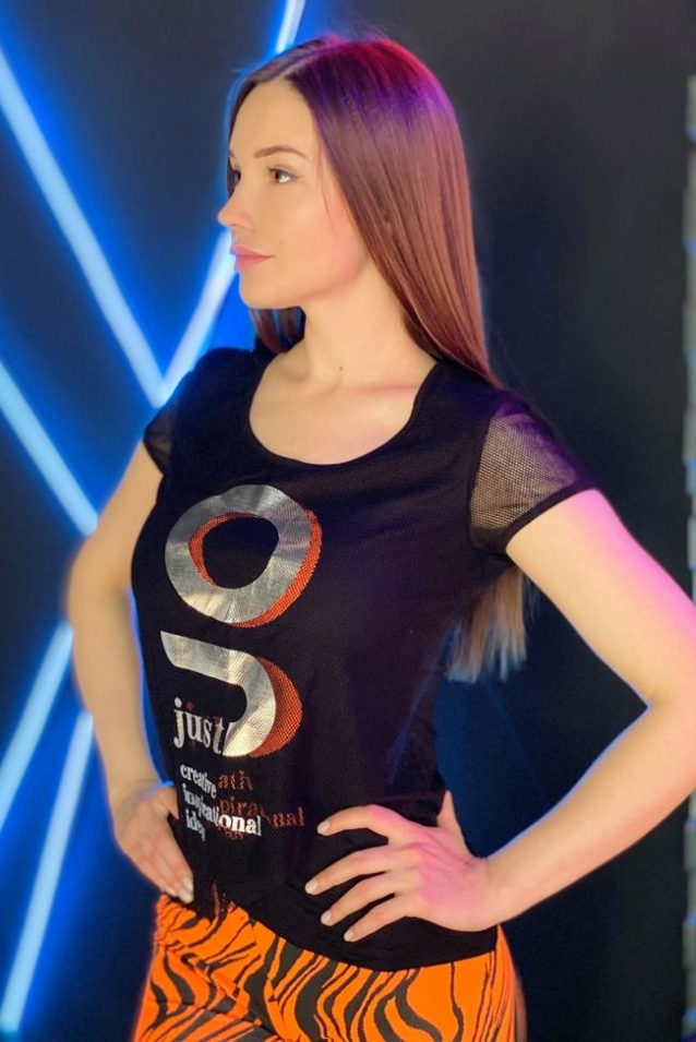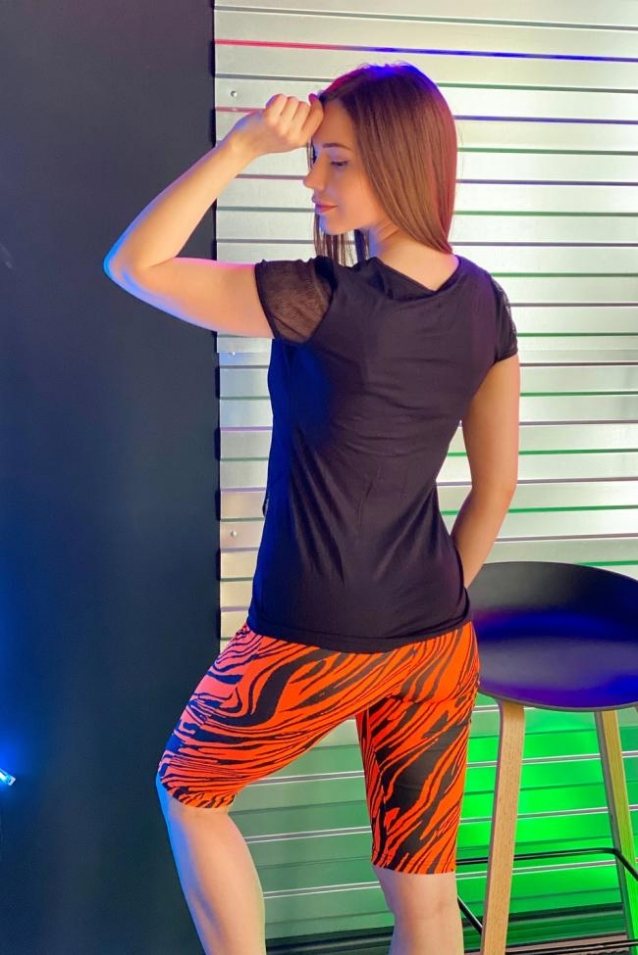 Футболка полуприлегающего силуэта, с округлой горловиной, длиной до середины бедра, с фигурным низом. Рукав втачной короткий, из сетки. Полочка выполнена из двух полотен, наложенных одно на другое. Верхнее полотно из сетки с принтом. Горловина обработана бейкой из основного полотна.