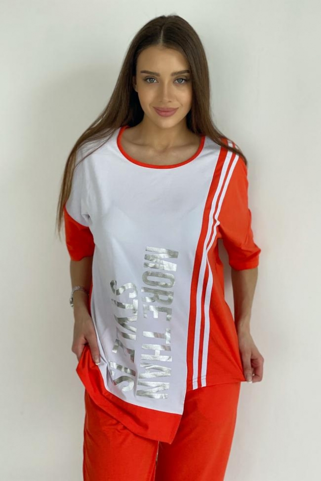 Футболка прямая, свободная, с округлой горловиной, с асимметричным низом. Рукав короткий. Центральная часть полочки выполнена из отделочного полотна. Вдоль шва соединения частей полочки расположены лампасы из отделочного полотна. Горловина обработана бейкой из основного полотна.
