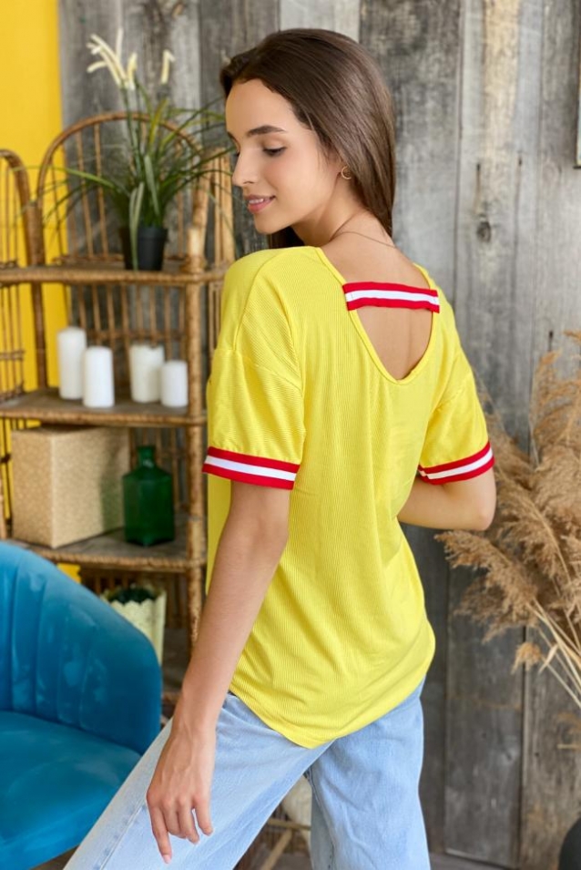 Футболка прямого силуэта, с округлой горловиной спереди, с удлиненной спинкой. Рукав короткий, обработанный декоративной тесьмой. В верхней части спинки обработан фигурный вырез с тесьмой. Горловина обработана бейкой из основного полотна.