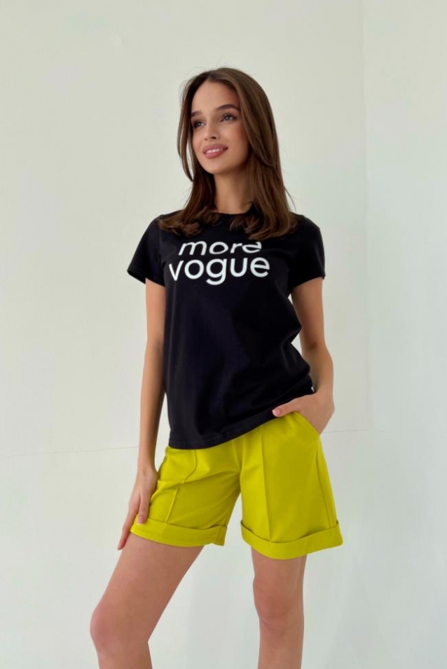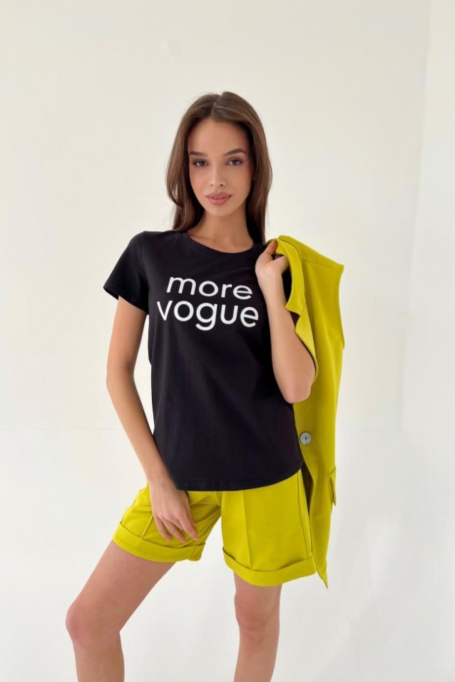 Футболка прямого силуэта, с округлой горловиной, длиной до середины бедра. Рукав втачной, короткий. Горловина обработана обтачкой из основного полотна.