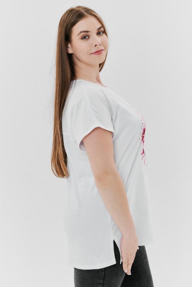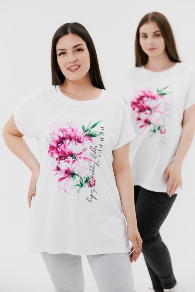 Футболка прямого силуэта, с округлой горловиной, с разрезами в нижней части боковых швов. Полочка с симметричными кокетками. Спинка с кокеткой, удлиненная. Горловина обработана обтачкой из основного полотна.
