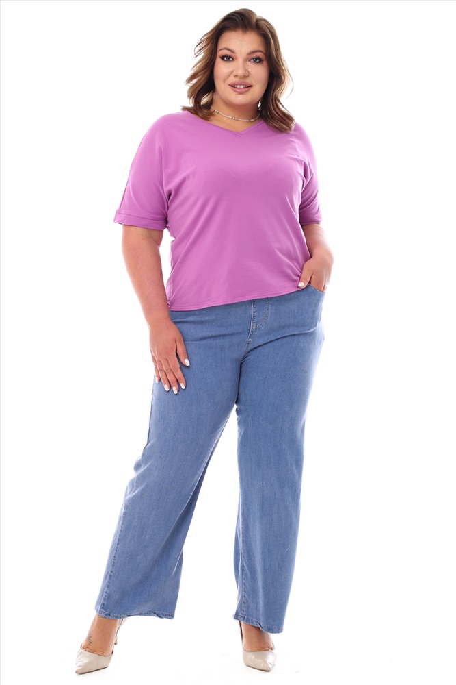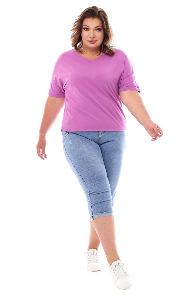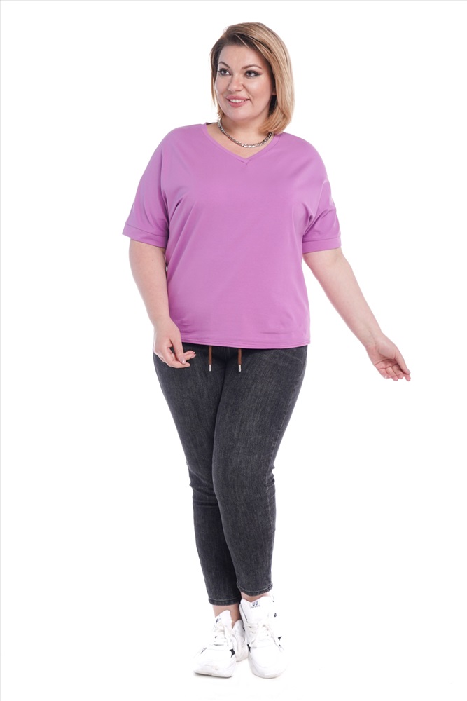 Футболка прямого кроя из мягкого трикотажа. Модель имеет V-образный вырез с узким кантом. Короткие цельнокроеные рукава, оформленные по низу небольшим отворотом. Свободный силуэт искусно обыгрывает фигуру и не сковывает движений. Модель легко сочетается с любым низом, поэтому скомбинировать чудесный и стильный образ с легинсами, брюками, шортами и джинсами не составит труда.