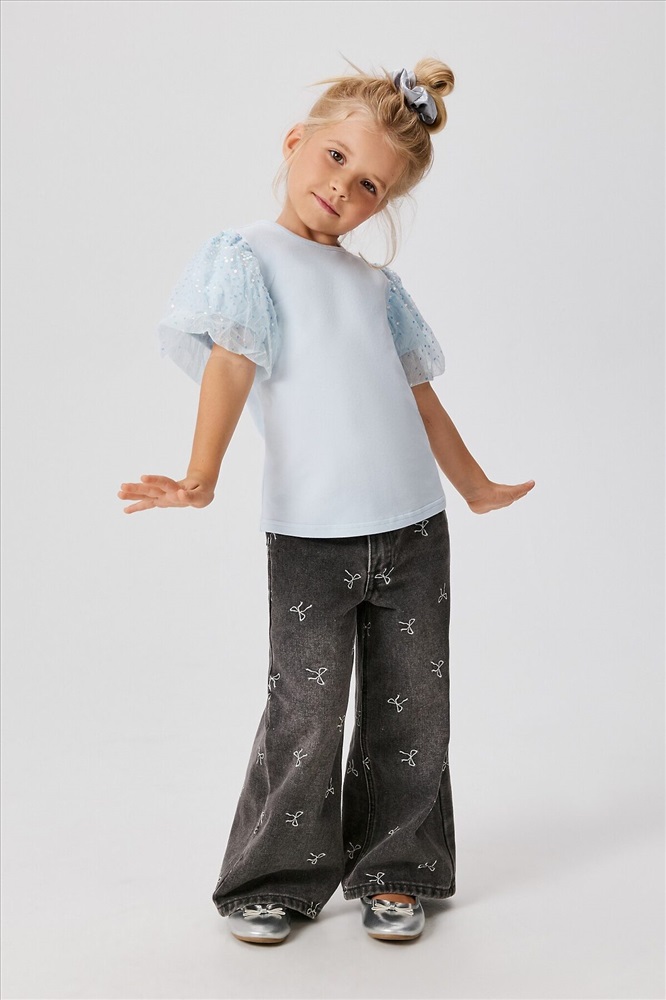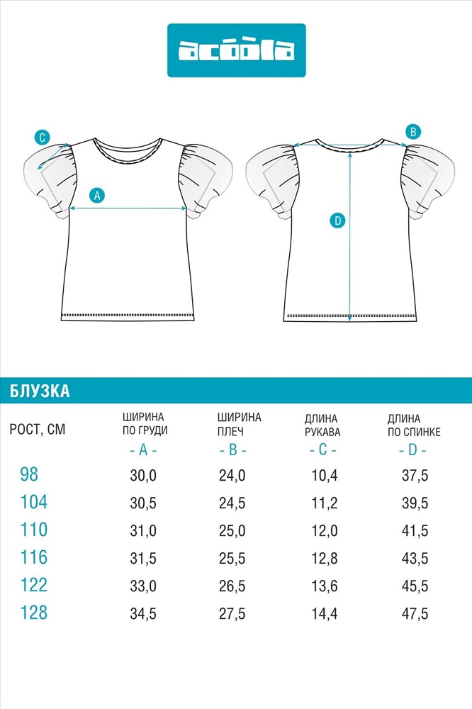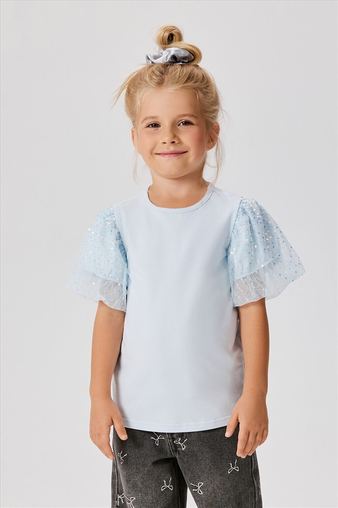 ID товара: 1214743 Состав: 95% Хлопок, 5% Полиуретан Сезон: Демисезон Длина: Средняя Фасон: Прямой Рукав: короткие Вырез горловины: Округлый Основная ткань: Хлопок Стиль: Нарядный Страна бренда: Россия Страна производства: Китай Блузка детская для девочек Kerbela голубой Комментарии к товару
