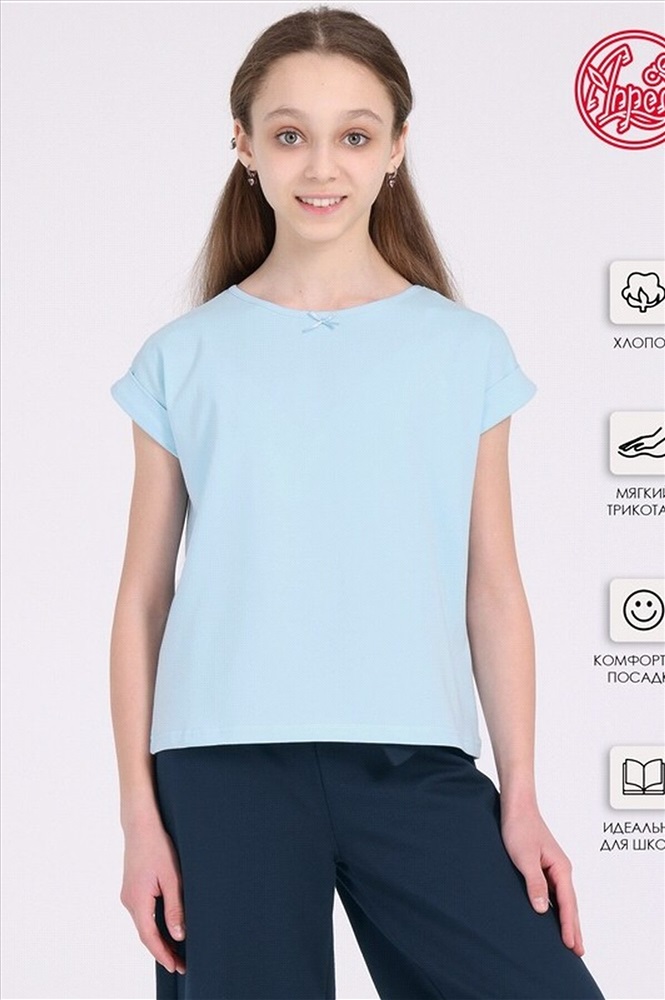 Футболка для девочки выполнена из легкого хлопкового полотна с лайкрой. Изделие со спущенным плечом с отворотом без рукавов и вырезом горловины лодочкой, украшено небольшим бантиком. Уход: только машинная стирка (руками не стирать!) при температуре 40 градусов, без предварительного замачивания. Материал: кулир с лайкрой