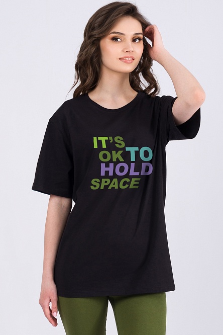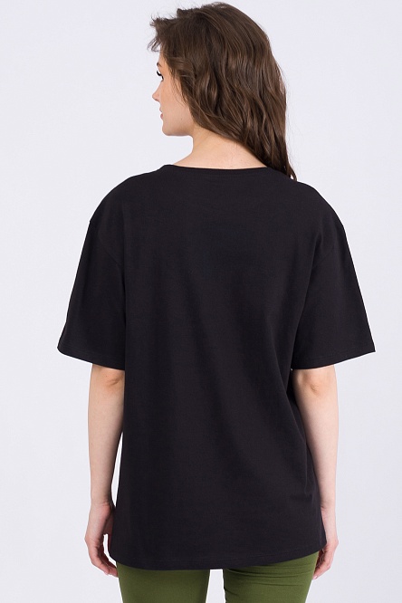 100% хлопок Тип ткани: Кулирка Удлиненная футболка черного цвета из мягкого хлопкового полотна с короткими рукавами и округлым вырезом. Яркий стильный принт вносит красок в данную модель.