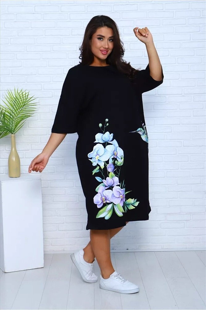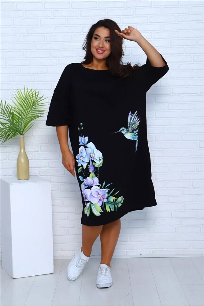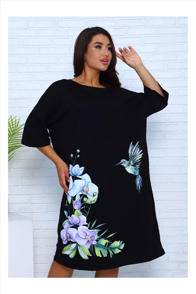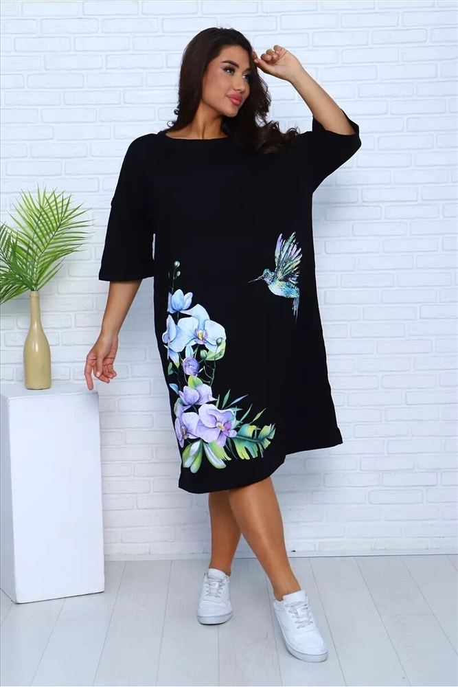 ID товара: 1127672 Состав: Хлопок 100% Сезон: Весна/Лето Длина: Ниже колена Фасон: Свободный Рукав: 3/4 Вырез горловины: Округлый Рисунок: цветочный Декоративные элементы: Принт Основная ткань: Хлопок Стиль: Повседневный Вид ткани: Кулирка Страна бренда: Россия Страна производства: Россия Платье - футболка для дома больших размеров из 100% хлопка. Приятная к телу дышащая ткань из которой сшиты наши туники в форме удлиненной футболки свободного кроя - идеальная версия домашней одежды. Большой рисунок с цветами и яркой колибри не смоется и не выгорит на солнце, не потускнеет от многократных стирок. Платье черного цвета выглядит наиболее выигрышно, а рисунок на нем смотрится особенно ярко и насыщенно. На средний рост длина платья будет ниже колена, на высоких девушках оно сядет чуть короче. Комментарии к товару
