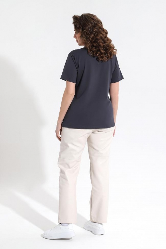 Футболка из гладкокрашеного трикотажного полотна «кулирка с лайкрой» классического покроя, с короткими втачными рукавами, горловиной V-образной формы, обработанной втачной планкой и принтом на полочке. Комментарии к товару