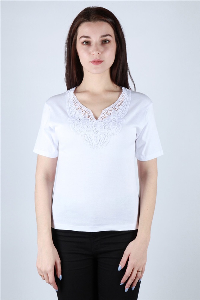 ID товара: 166450 Состав: Хлопок 92%, Эластан 8% Сезон: Демисезон Длина: Средняя Фасон: Полуприлегающий Рукав: Короткий Вид застежки: Нет Вырез горловины: V-образный Декоративные элементы: Кружево Основная ткань: Хлопок Стиль: Повседневный Страна бренда: Турция Страна производства: Турция Футболка женская с короткими рукавами. Прямой, полуприлегающий силуэт. V-образный вырез горловины с кружевом. Есть несколько расцветок. Комментарии к товару