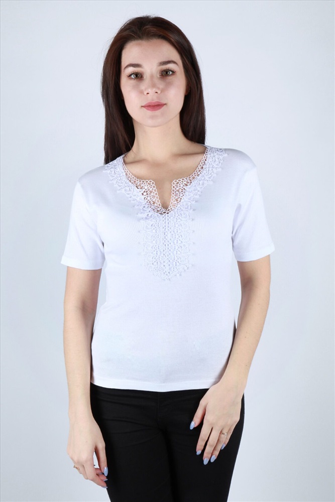 ID товара: 166462 Состав: Хлопок 92%, Эластан 8% Сезон: Демисезон Длина: Средняя Фасон: Полуприлегающий Рукав: Короткий Вид застежки: Нет Вырез горловины: Фигурный Декоративные элементы: Кружево Основная ткань: Хлопок Стиль: Повседневный Страна бренда: Турция Страна производства: Турция Футболка женская с короткими рукавами. Прямой, полуприлегающий силуэт. Фигурный вырез горловины. Комментарии к товару