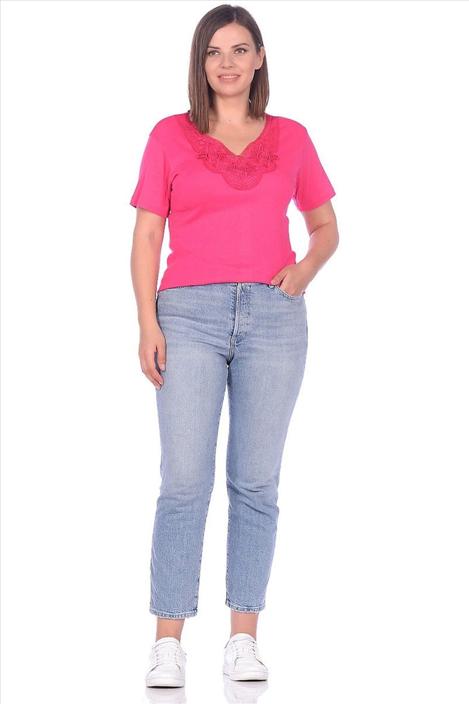 Футболка женская с короткими рукавами. Прямой, полуприлегающий силуэт. V-образный вырез горловины с кружевом. Есть несколько расцветок.