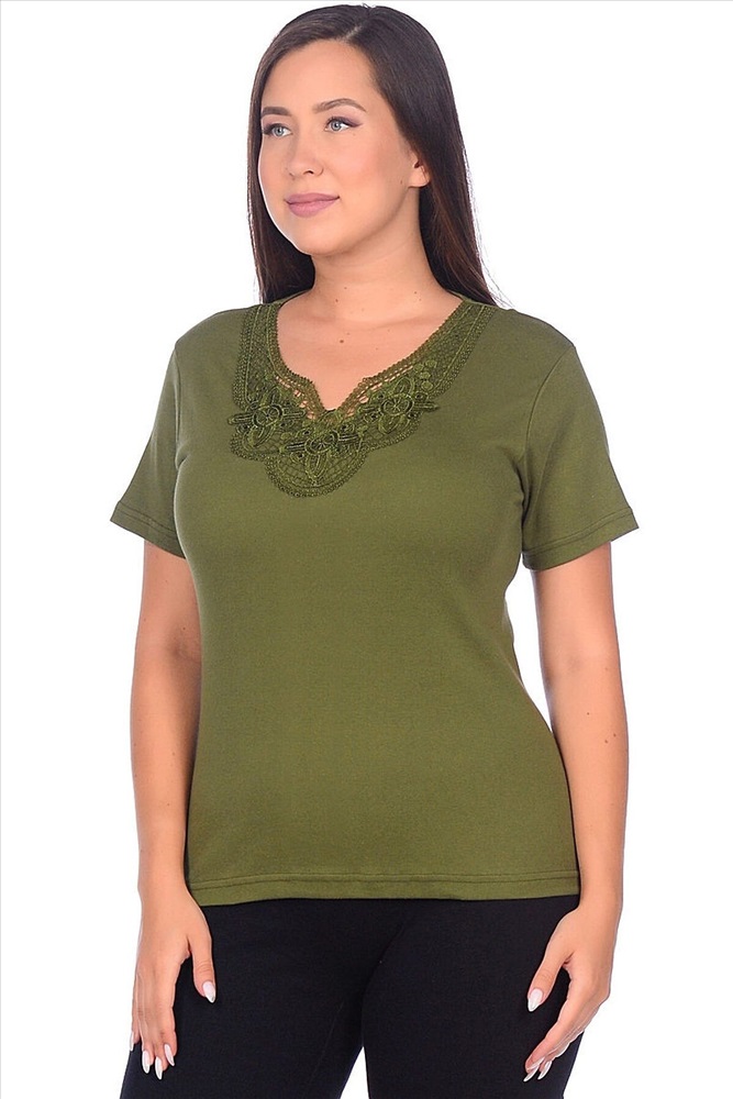 Страна производства: Турция Футболка женская с короткими рукавами. Прямой, полуприлегающий силуэт. V-образный вырез горловины с кружевом. Есть несколько расцветок.