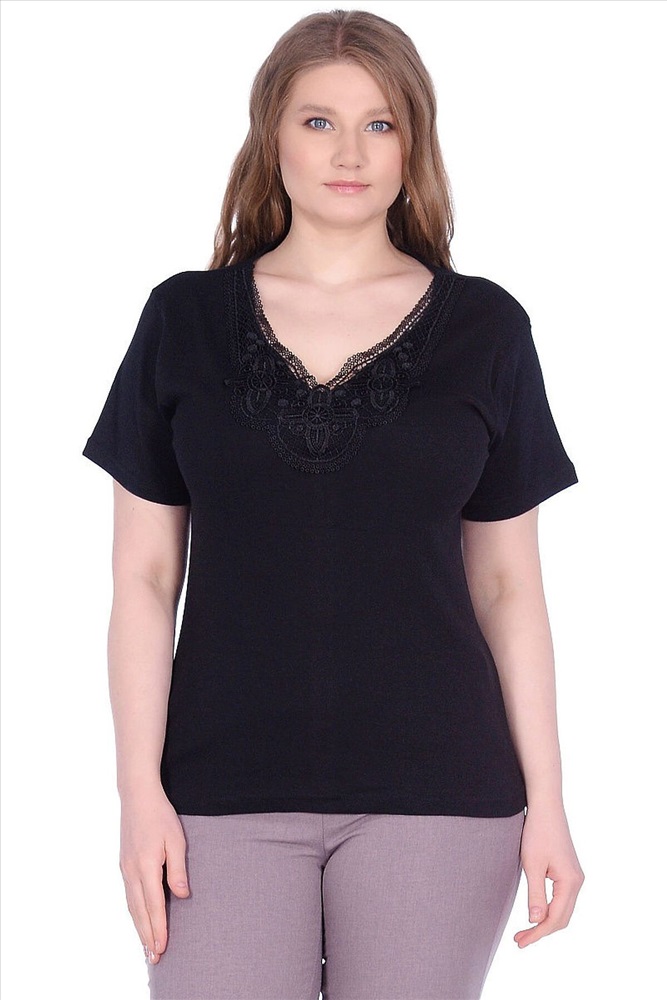 Футболка женская с короткими рукавами. Прямой, полуприлегающий силуэт. V-образный вырез горловины с кружевом. Есть несколько расцветок.