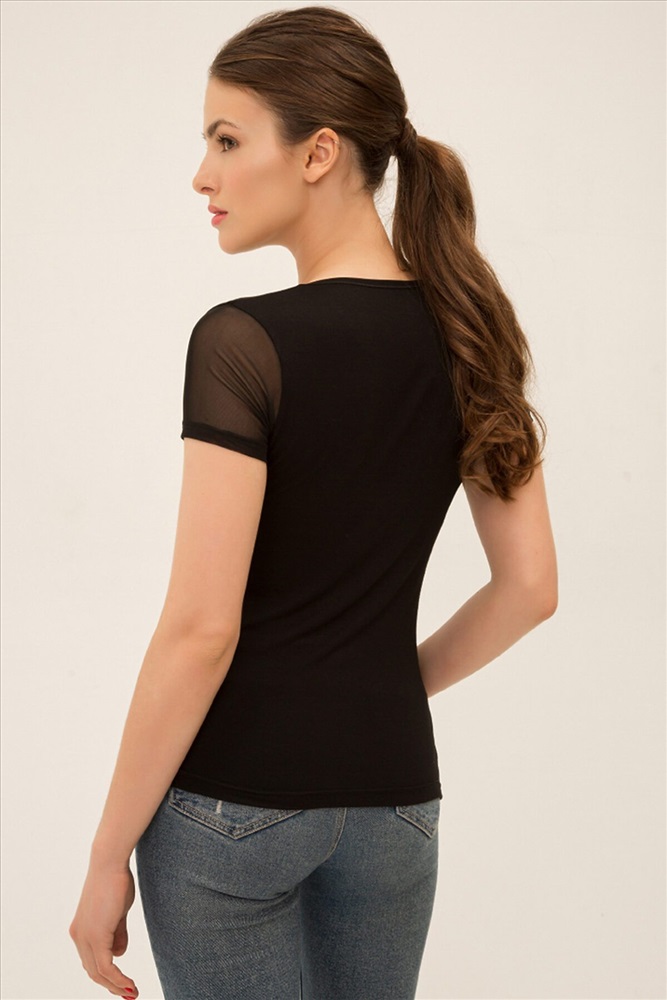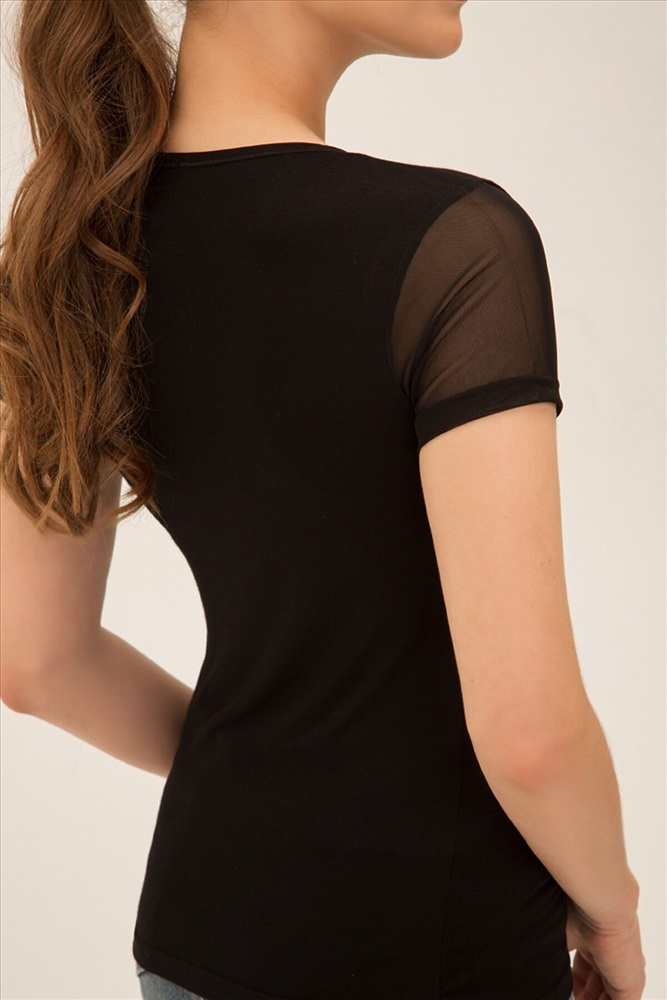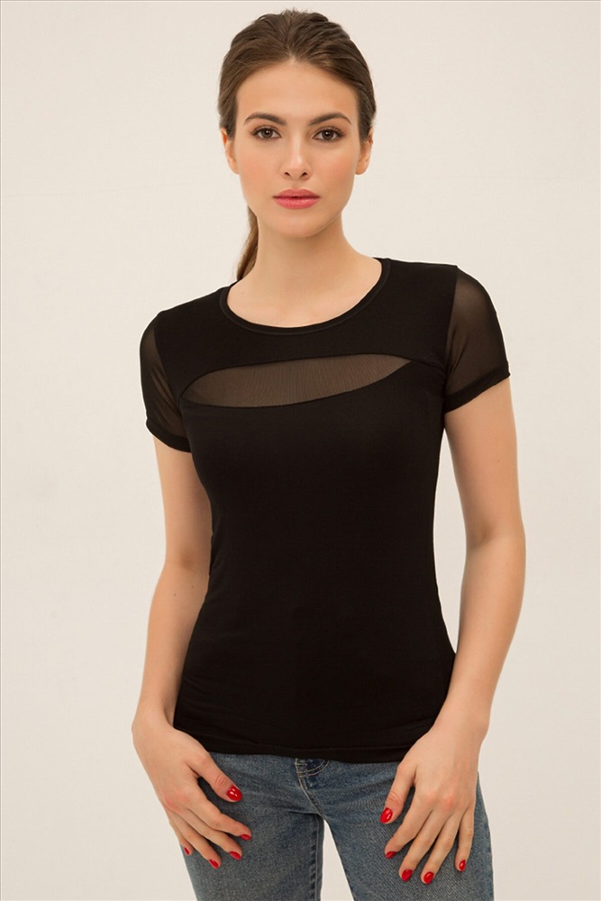 Женская облегающего кроя футболка с круглый вырезом и коротким рукавом. Декорирована прозрачной сеткой.
