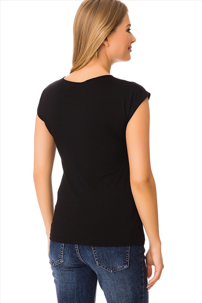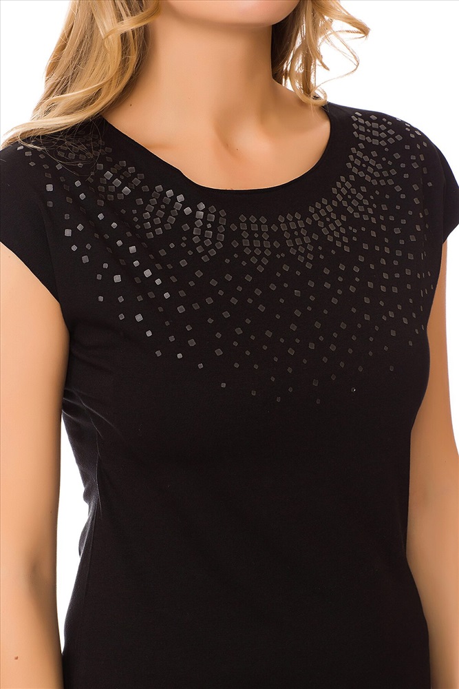 Футболка облегающего кроя с коротким рукавом и округлым вырезом горловины, декорированная стразами.