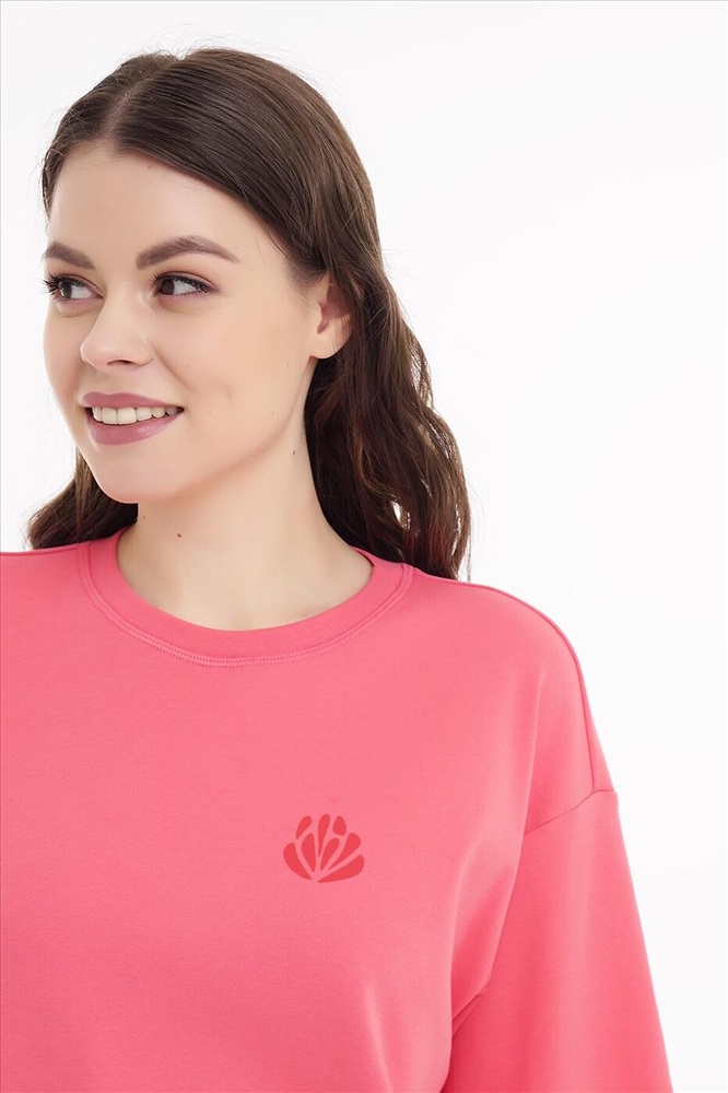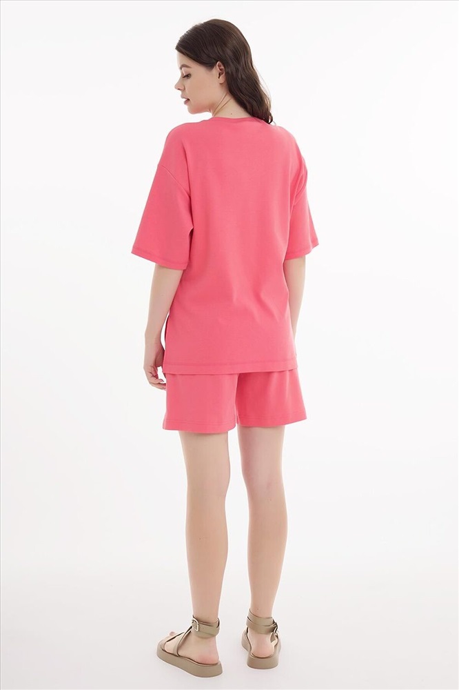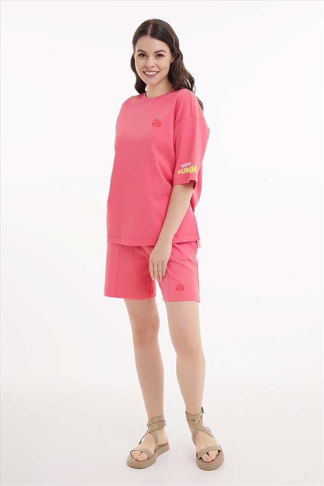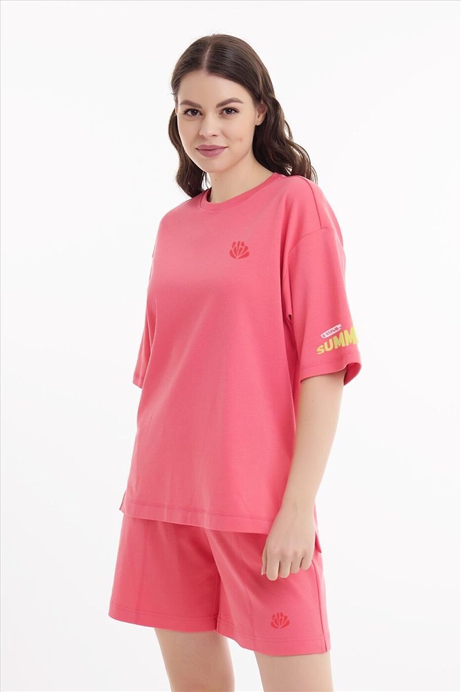 Футболка для дома и отдыха из трикотажного полотна интерлок прямого кроя. Округлая горловина с обтачкой. По горловине, низу рукава и изделия застилы. Короткий рукав со спущенный линией плеча. Спереди и по рукаву принт. По бокам разрезы.