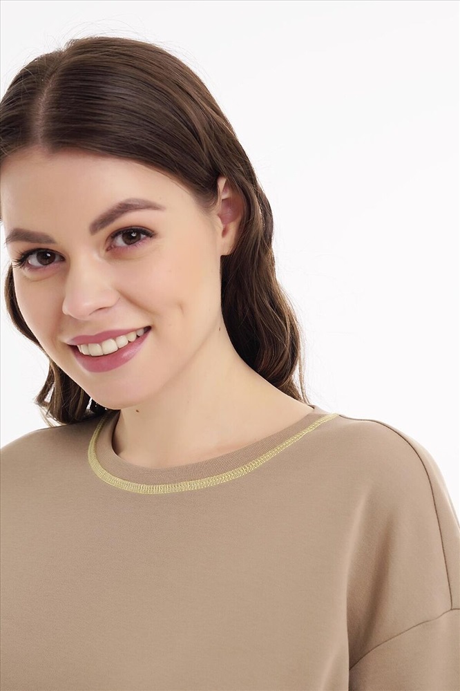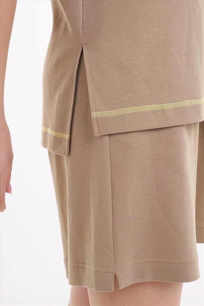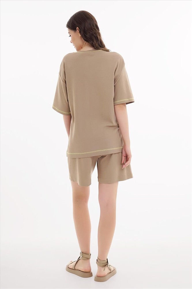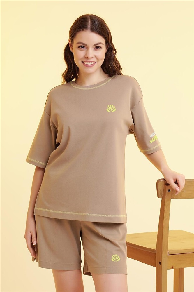 Футболка для дома и отдыха из трикотажного полотна интерлок прямого кроя. Округлая горловина с обтачкой. По горловине, низу рукава и изделия застилы. Короткий рукав со спущенный линией плеча. Спереди и по рукаву принт. По бокам разрезы.